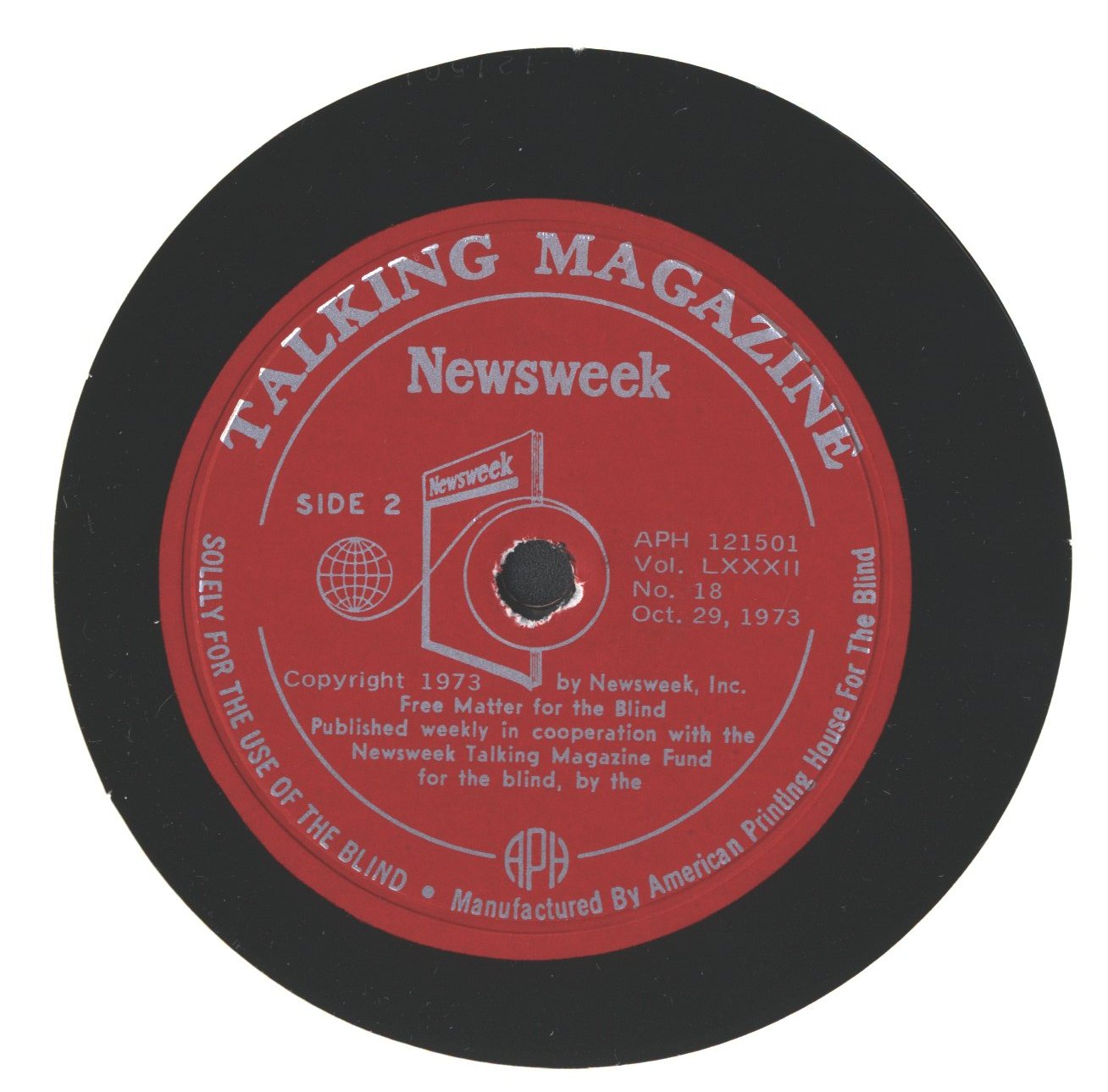 - October 29, 1973 issue, volume 82, no. 18. APH 121501, "Published weekly in cooperation with the Newsweek Talking Magazine Fund for the blind, by the APH" --disc label.