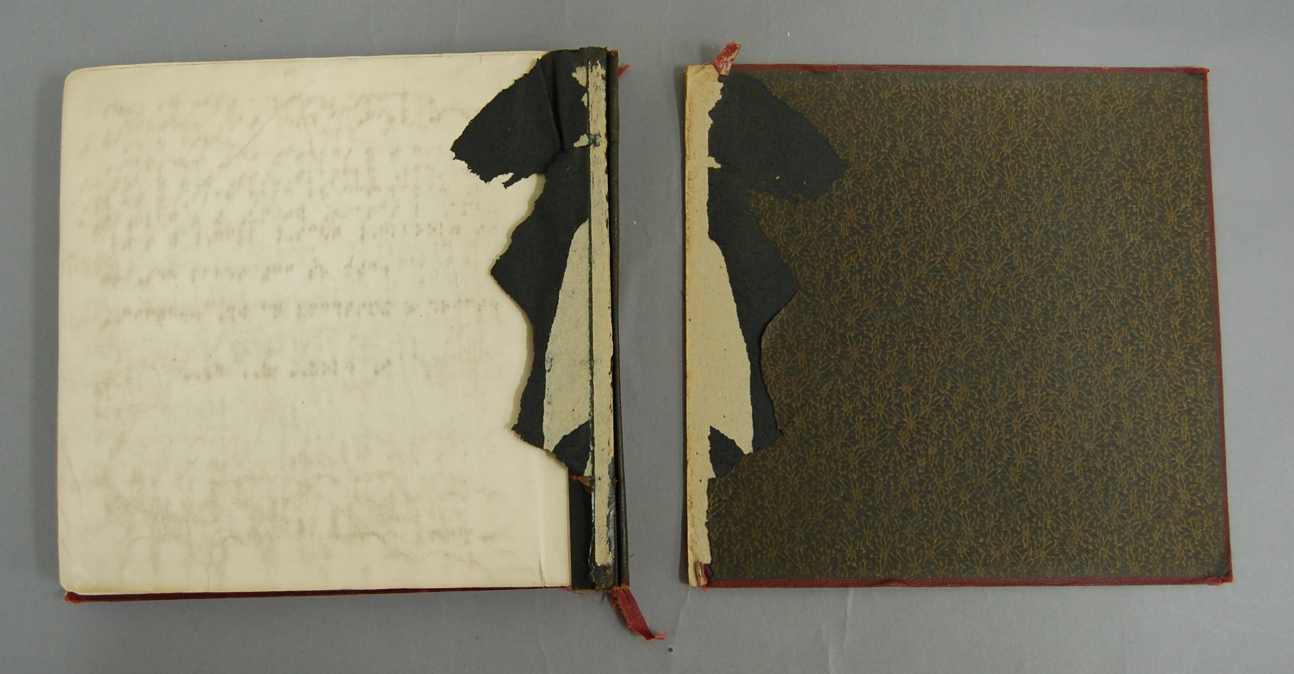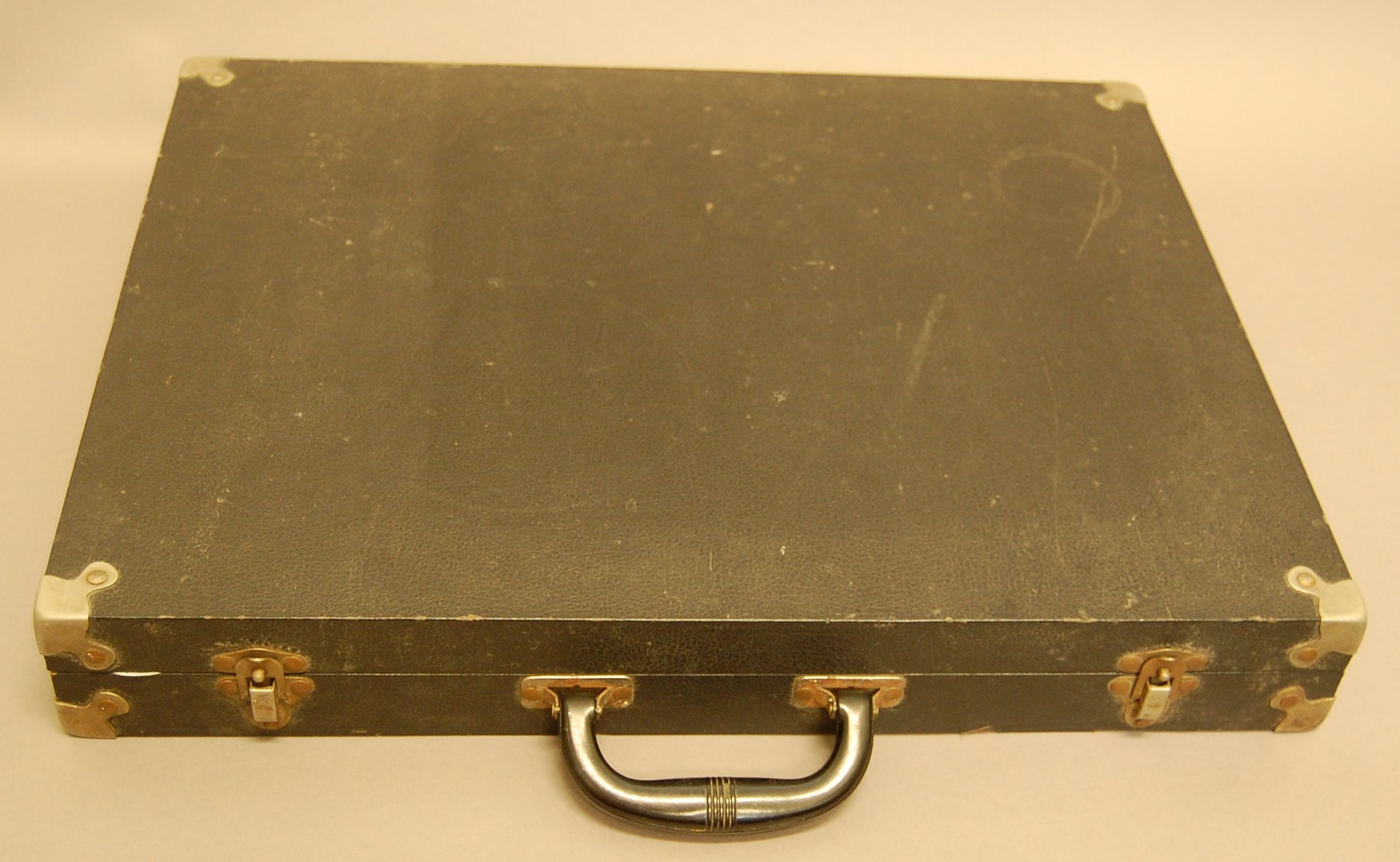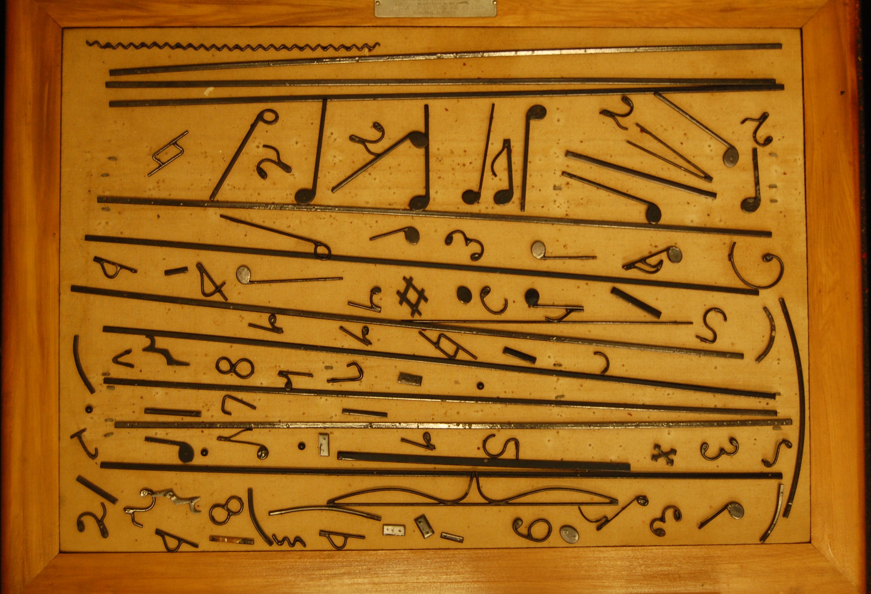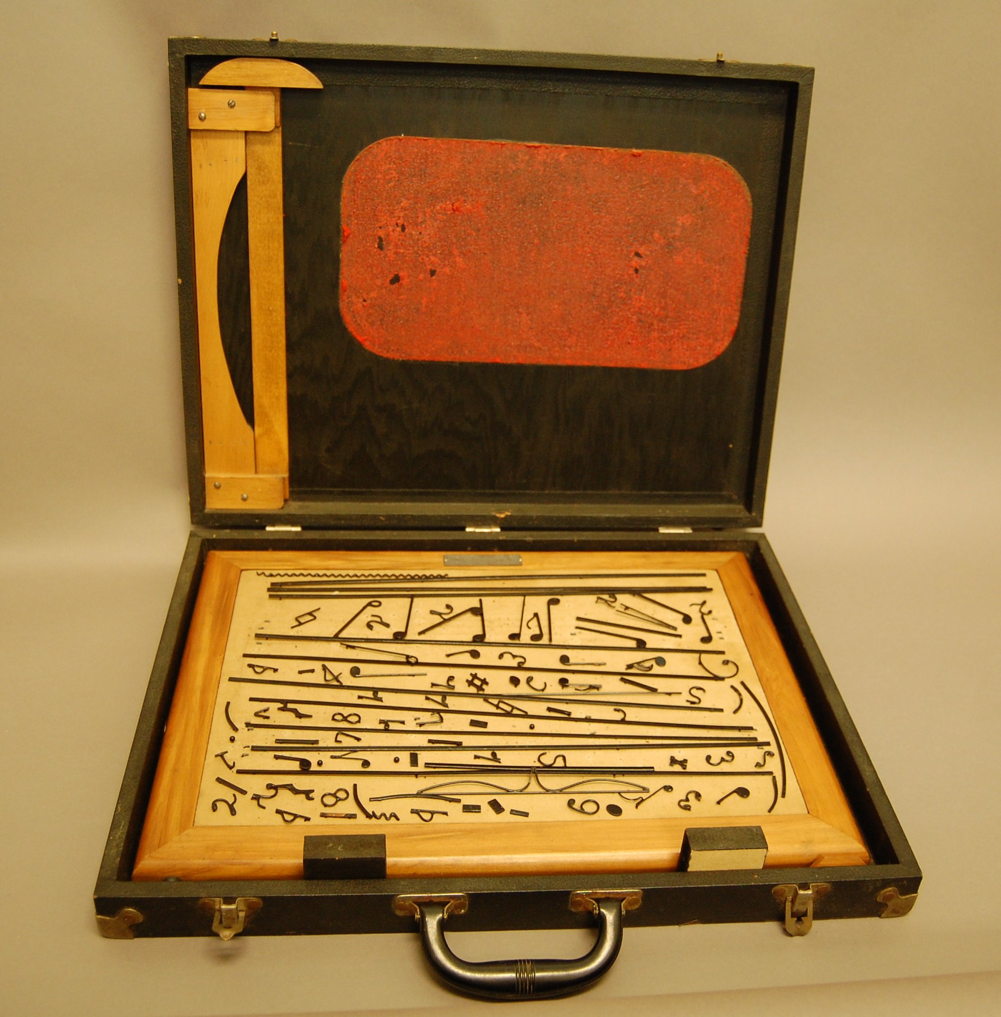 - (a) Wooden panel on back, secured with brass screws; wooden frame; cloth-covered cork pin-board; two black rubber rests on lower edge of main board; (b) "square measure" basically a wooden T-square pinned together with brads and round head screws; (c) black leatherette covered wooden case; hinged lid with two latches; corners reinforced with riveted metal corners; black rubber carrying handle; red foam pin board glued to inside of lid along with wooden bracket for the square measure; (de) pair of black particle board squares described as leger gauges in product literature; roughly 129 pieces of black-enameled, pin-back steel notation pieces.