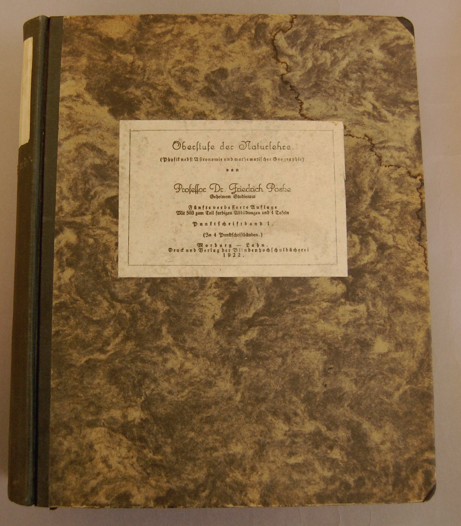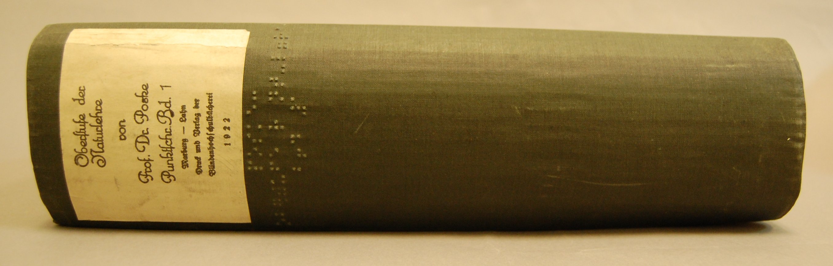 - "Punktschriftband 1" --cover label. Interpoint braille. Museum holdings: volume 1. Gray/black marbled paper over boards; black cloth on spine and tips of corners; standard print labels on spine and front cover; braille label embossed in cloth on spine; pages (signatures) thread-stitched.