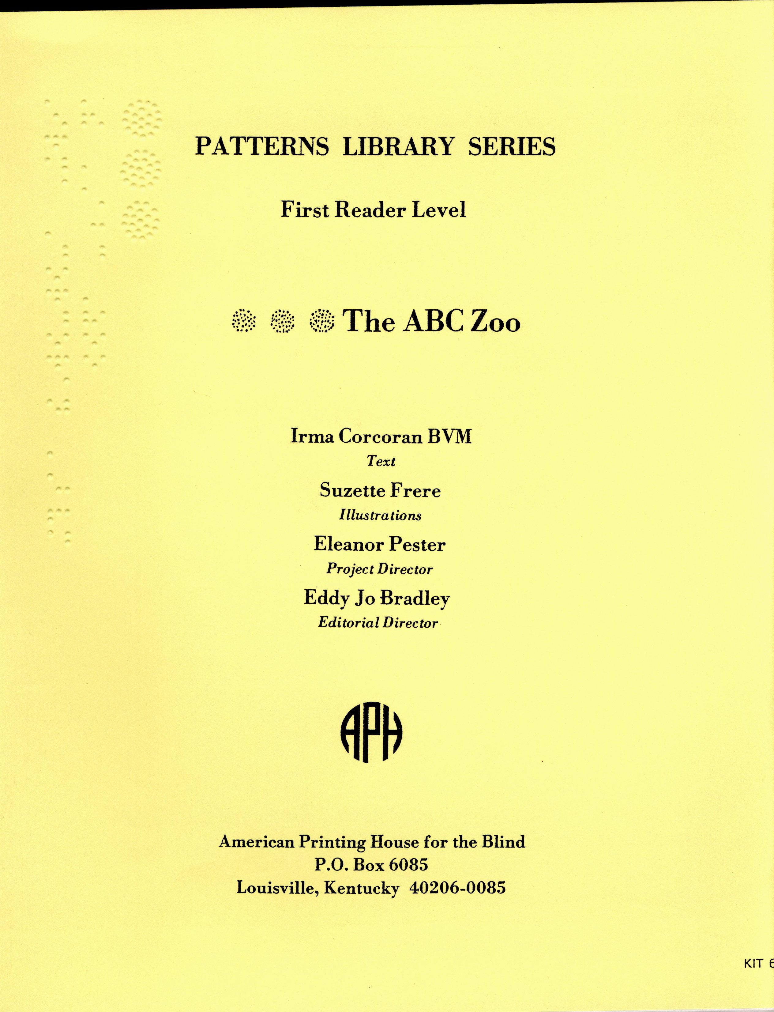 - The First Reader Level of the Patterns Library Series was first made available for purchase from the American Printing House for the Blind (APH) in November 1984.The Patterns Library Series was designed to supplement Patterns: The Primary Braille Reading Program, with books that corresponded in level content, color, and size to those in the reading program. This kit was transferred in 2019 to the Museum of the American Printing House for the Blind (APH) from the APH Research Department, where it had been stored with project materials of Eleanor Pester.