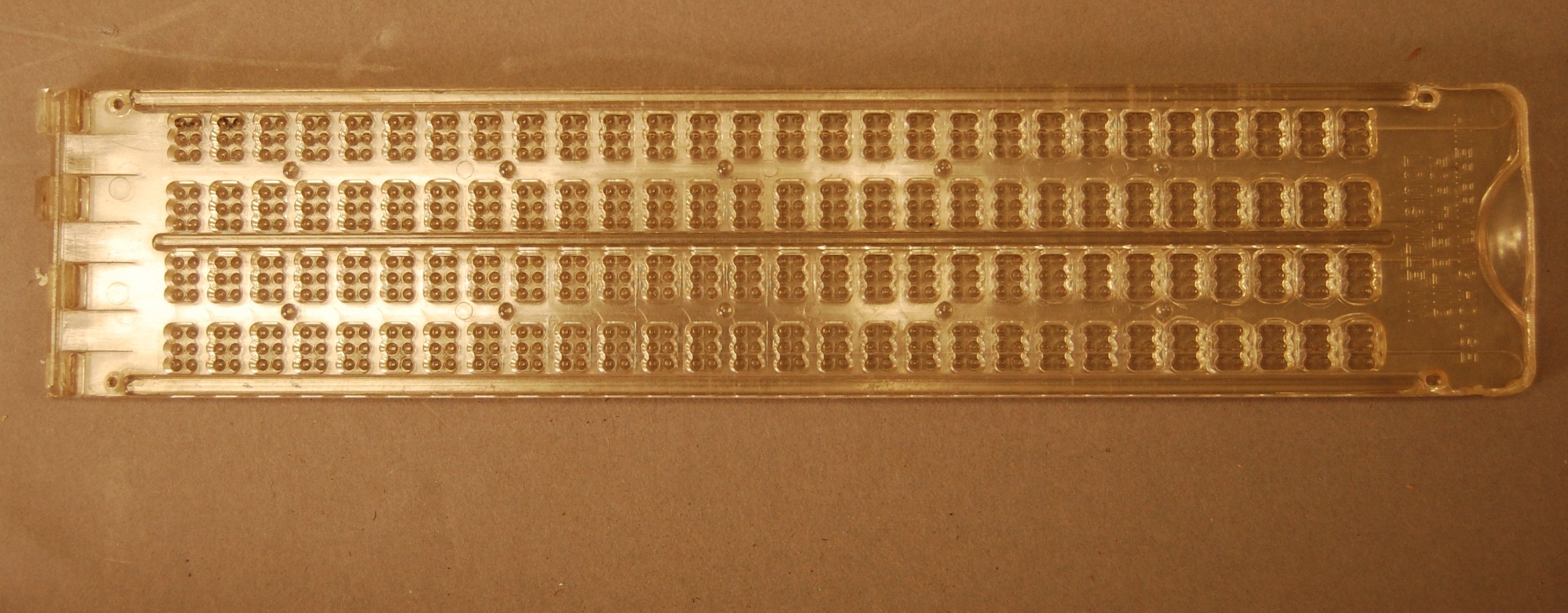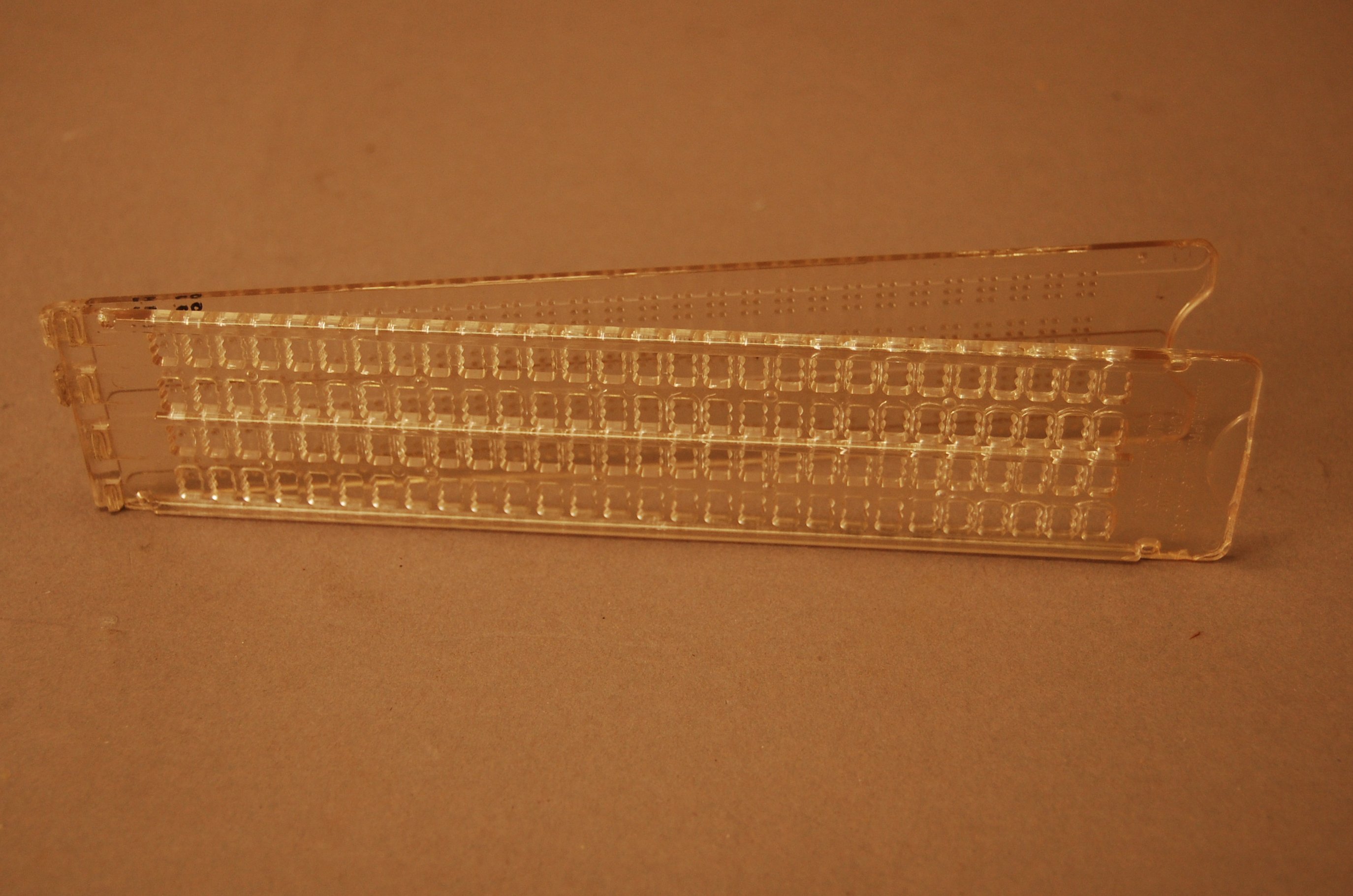 - Clear plastic braille slate; piano hinge on one side; four (4) lines of twenty-eight (28) braille cells; slight indents in top frame guide placement of stylus; bottom frame cast with six indented holes under each opening in the top frame; three horizontal raised lines on top frame; raised lip on open end of upper frame facilitates opening; four registration pins up from lower frame fit into holes in upper frame; cast into upper frame, "AMER. PRINTING HOUSE FOR THE BLIND LOUISVILLE, KY."