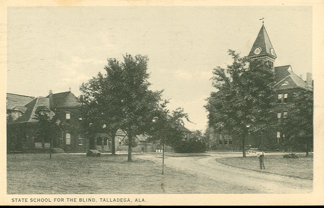 - Black & white photo of 2 brick buildings. A building with a central tower is on the right; to its left is a two-story building with a covered porch and curved bay. Trees partially obstruct the view. "State School for the Blind, Talladega, Ala." is printed along the bottom left edge. The back of the postcard is divided, used, and postmarked 1924. "C.T. Doubletone" is printed along the center, between the dividing line. A circular C.T. logo, approximately 1/8 in. (diameter), is printed at the bottom of the line. "AD-1329" is printed at the top center. Similar view on two other postcards in museum collection, accessions 2001.31 and 2001.36.