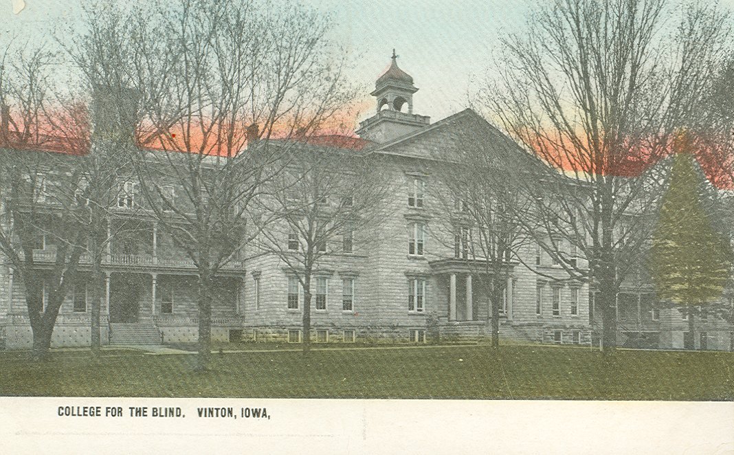 - Front of postcard shows a tinted photo of the front of the school building; four stories made of stone; columns at main entrance; cupola over entrance. There is a horizontal, orange-reddish band of color above the roofline. Printed at bottom left corner is "College For The Blind, Vinton, Iowa." Back is divided and used. "Suhling Co., Pub. Chicago" is printed along dividing line.