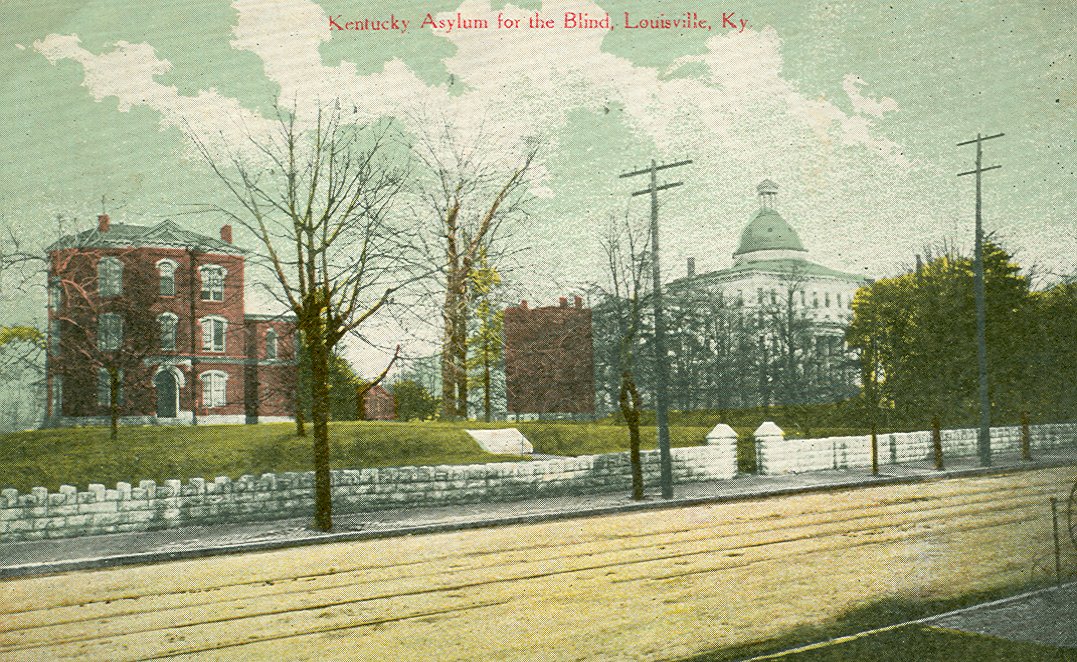 - Color-tinted photo; shows the Kentucky School for the Blind, on the right, and the American Printing House for the Blind, on the left. The KSB building is multistoried with a large central dome. This building was demolished in 1967. The APH building is the original 1883 brick structure with arched entry and arched windows. A stone fence runs along both properties. Printed along the center top edge is "Kentucky Asylum for the Blind, Louisville, Ky." The back of the postcard is divided and used. It is postmarked 1913. The message appears to have been written with the use of a writing guide.