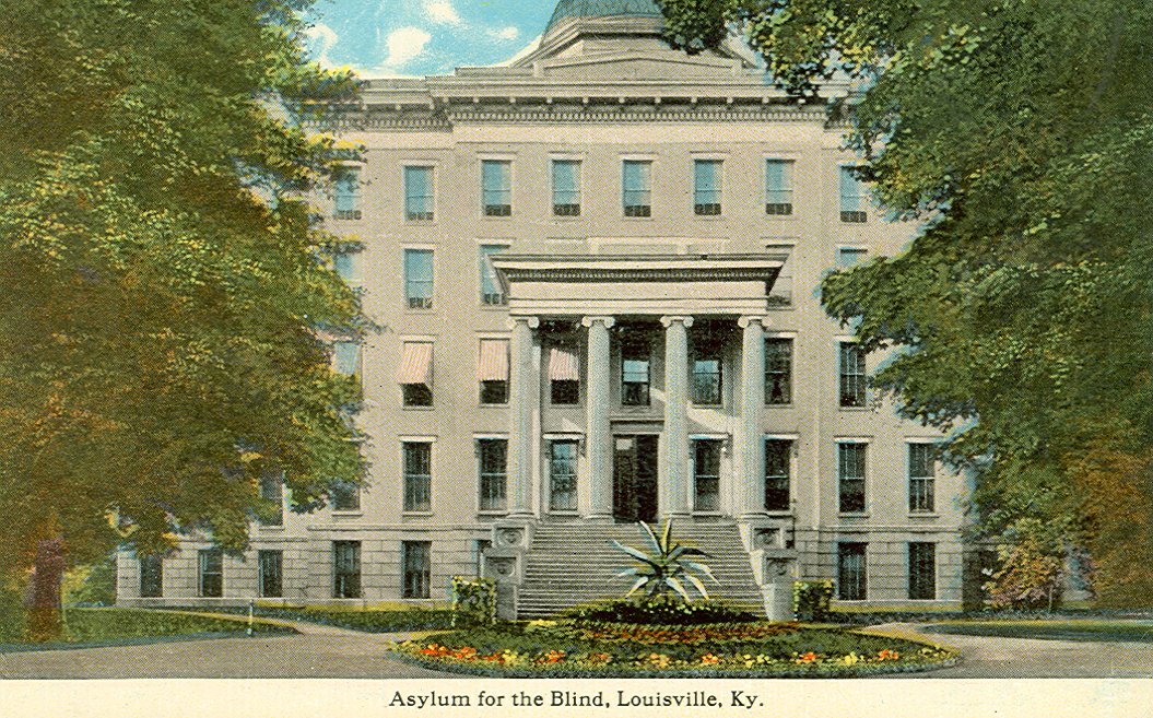 - Item shows the front of the school building. The building is stone with ionic columns and a domed roof. Beneath the picture reads "Asylum for the Blind, Louisville, Ky." Back of postcard is divided with an area for messages and an address area (both unused); printing on left edge reads "Published By Bagley-Howe Drug Co. Louisville, KY. Made in U. S. A." Printed in the middle is "C. T. Photocrom."