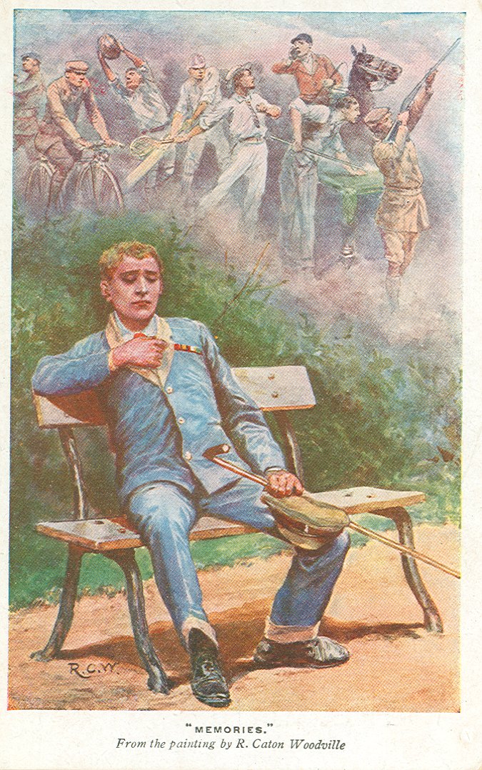 - "Memories." From the painting by R. Caton Woodville. --printed along bottom front edge. Color picture shows a blind soldier sitting on a park bench. Above him are images of his memories. Back of postcard is divided and unused. Text printed on the back, at upper left corner, describes St. Dunstan's rehabilitation program for soldiers blinded in war. The postcard solicits contributions for an "After-care Branch established by the National Institute for the Blind."