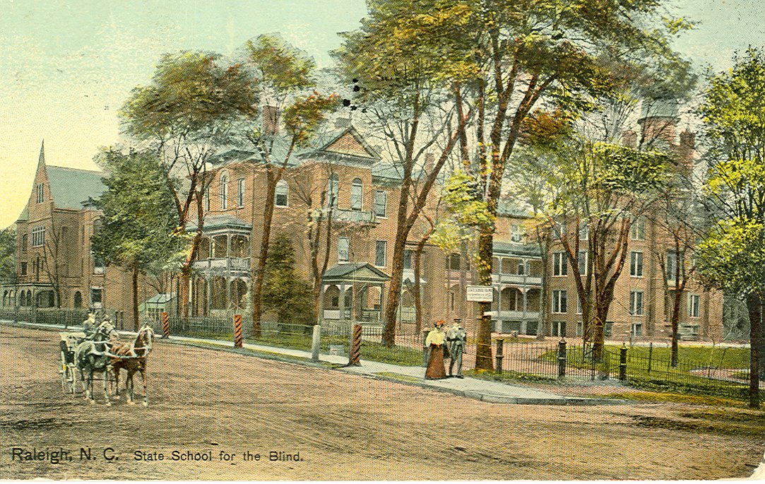 - Picture shows the buildings of the North Carolina State School for the Blind and the cross streets at the corner of the property. Printing at the bottom, left corner of the card reads "Raleigh, N. C. State School for the Blind." The back is used and is divided. Printing along the left edge reads "The Leighton & Valentine Co., N.Y. City. 27928 Printed in United States." The manufacturer's logo is printed at the top, center of the back of the card and around it is printed "Famous Quality Throughout The World." The postcard bears a postmark of August 12, 1914. The picture is identical to another postcard in the museum collection (1999.57).