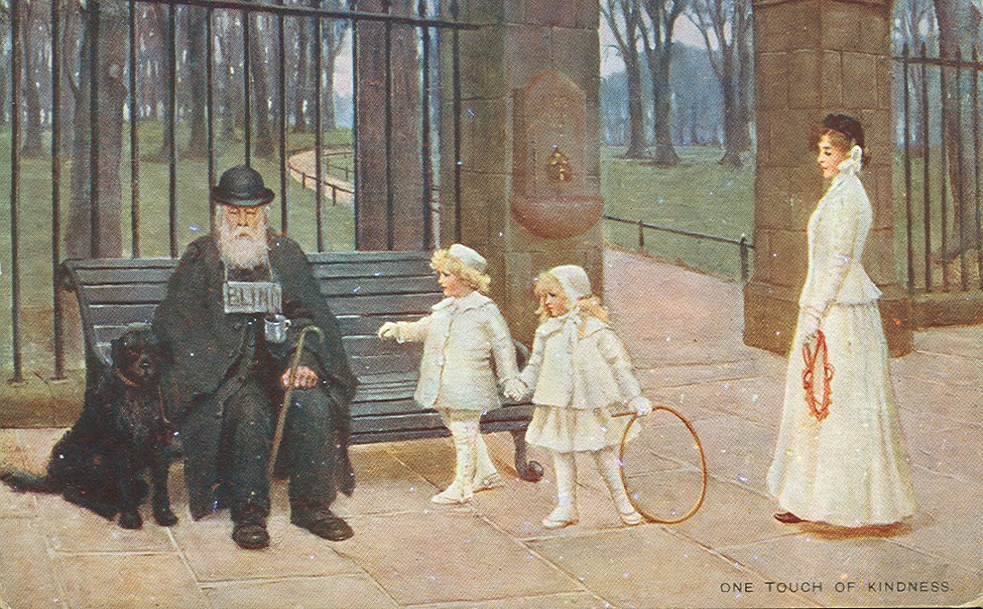 - Postcard shows a color illustration of an elderly blind man dressed in a black hat, suit, and overcoat, sitting on a park bench in front of a park [?] entrance. A sign that reads "Blind" hangs from his neck, with a silver cup beneath. He is holding a cane in his left hand, and to his right is a black dog. Two young, well-dressed children are approaching him, one with an outstretced hand, to place money in the cup. A woman, who is with the children, watches and waits to the side. The clothing appears to be Victorian-era. Printed at the bottom right corner is "One Touch of Kindness." The back of the unused postcard is divided by a short 1/2 in. line extending beneath the publisher's logo, approx. 7/8 x 1/2 in., of a woman holding a large painter's palette in which is printed "W & K London." Along the left edge is printed "Wildt & Kray, London, N.W. Series No. 1719. Printed in England."