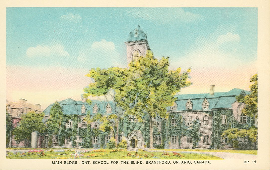 - Color illustration of the front of the school building, which has a central tower, arched windows, and an arched entryway. Another building is partially visible. "Main Bldgs., Ont. School for the Blind, Brantford, Ontario, Canada" is printed along the bottom edge. "BR. 14" is printed in the bottom right corner. Back of postcard is divided and unused. "Copyrighted, Published by Valentine-Black Co., Ltd., Toronto, Canada" is printed along the left edge.