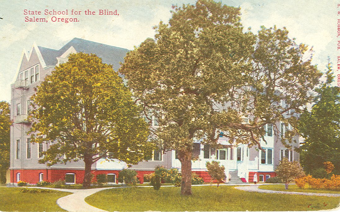 - Postcard shows a tinted photo of the front of the multistoried school building. Trees obstruct the view. "State School for the Blind, Salem, Oregon" is printed in red at upper left corner. Publisher's info is printed in red along upper right edge. Back of postcard is divided and used; date of postmark is illegible. Message is dated 1913.