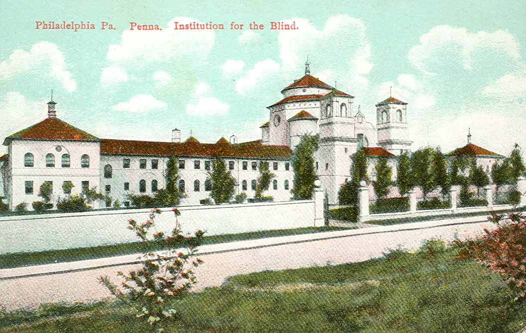 - On the front of the postcard is a color-tinted photo showing the front of the school with the following printed at the top "Philadelphia, Pa. Penna. Institution for the Blind" in red ink. The building is Mediterranean style; white with a red roof. The back of the card is used. A green line divides the message and address sections. Printed along the left edge in green is "No. 604. Printed in Germany." A message dated June 20, 1909, is on the back; the card was not mailed.