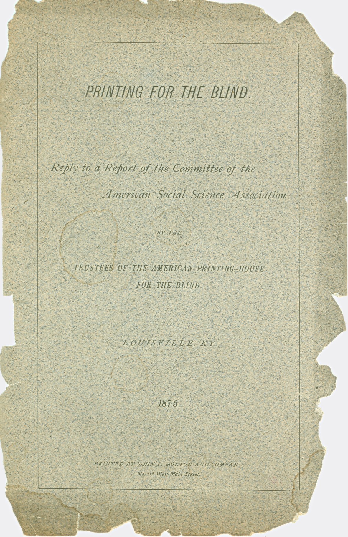 - Reply of the American Printing House for the Blind refutes remarks made in an 1875 report of the American Social Science Association (ASSA) about the printing of tactile books and manufacture of educational apparatus for use in the instruction of blind students. It also addresses APH concerns about ASSA support for the proposal of S.P. Ruggles to set up a publishing establishment. Paperbound with gray cover.