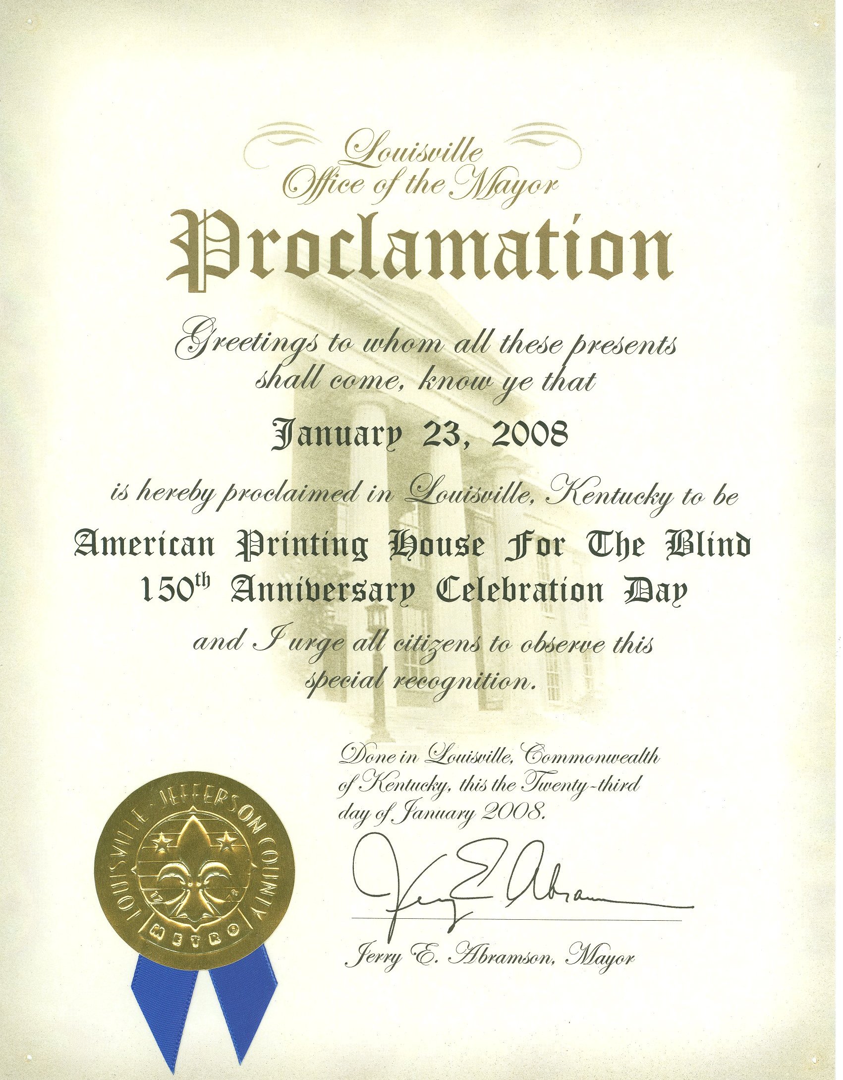 - Proclamation reads: "Louisville Office of the Mayor, Proclamation, Greetings to whom all these presents shall come, know ye that January 23, 2008 is herby proclaimed in Louisville, Kentucky to be American Printing House for the Blind 150th Anniversary Celebration Day, and I urge all citizens to observe this special recognition. Jerry E. Abramson, Mayor," with mayor's handwritten signature. On one side of a single sheet of ivory parchment paper with tinted edges; a background image of Louisville Metro Hall, at center; at bottom left, an embossed gold-foil and blue-ribboned seal of the Louisville Metro Government (fleur-de-leis and two stars encircled by the words "Louisville Jefferson County, Metro").
