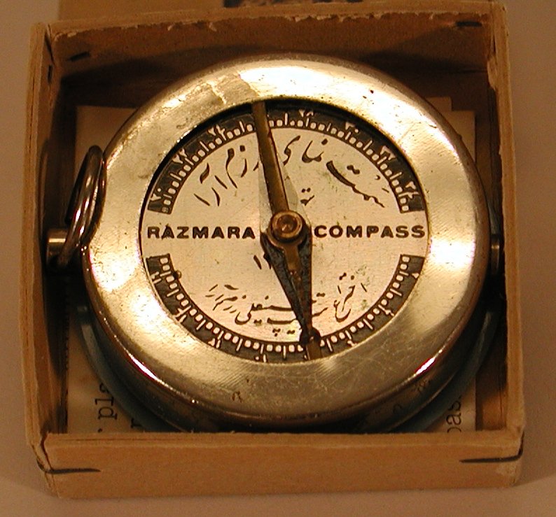 - The Razmara compass was invented for use by people who are blind. The bottom of the compass is made of plastic and is light blue in color. The upper part is made of metal. The north end of the compass needle has projecting ridges; the south end of the needle is smooth. The compass has a graduated dial. "Razmara Compass" is printed on the face of the compass. The compass is stored in a cardboard box. Printed on the box is "Razmara Compass Contact Model II (for blind)." Printed on the inside of the box lid is "Invented by Brig. -general Hossein - Ali Razmara Amir Abad Ave., Tehran, Iran." A sheet of instructions is included. An illustration of the compass is on the sheet; it varies somewhat from the actual compass. The sheet also has "Contact Model I" printed on it.