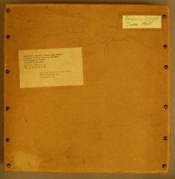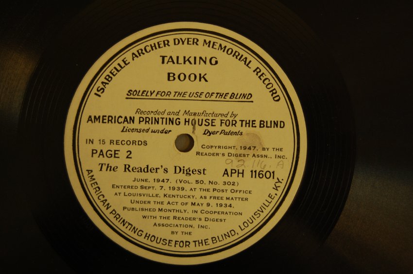 - June 1947 issue in original fiberboard mailing container. "Isabelle Archer Dyer Memorial Record Talking Book, Solely For The Use Of The Blind. . . Licensed Under Dyer Patents." --label. Reproduced from: Reader's Digest Association, Inc., Pleasantville, NY, 1947. Narrated by Walter Gerard, Jim Walton, Livingston Gilbert, and Burt Blackwell