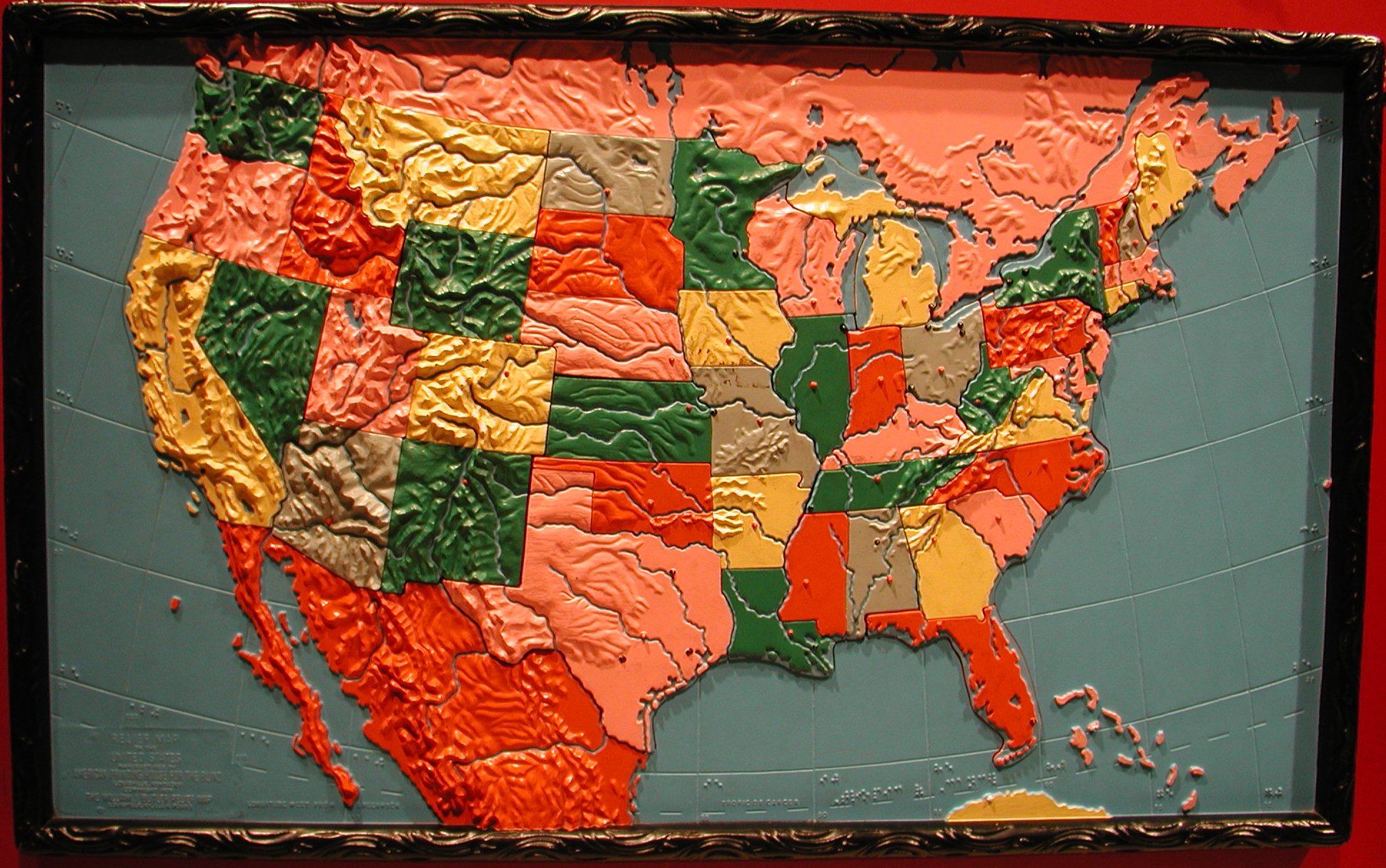 - Molded from rigid plastic, hand-painted, and dissected so that states can be lifted out. Each state is a different color, bodies of water are blue and depressed. Capitals and large cities denoted by nailheads. Exaggerated elevations; longitude and latitude lines are depressed with positions given in braille. Front of map reads "Relief Map of the United States, Manufactured by American Printing House for the Blind, Louisville, Kentucky, copyright 1939, The William J. Butler Relief Map, Louisville, KY, U.S.A. #24613."