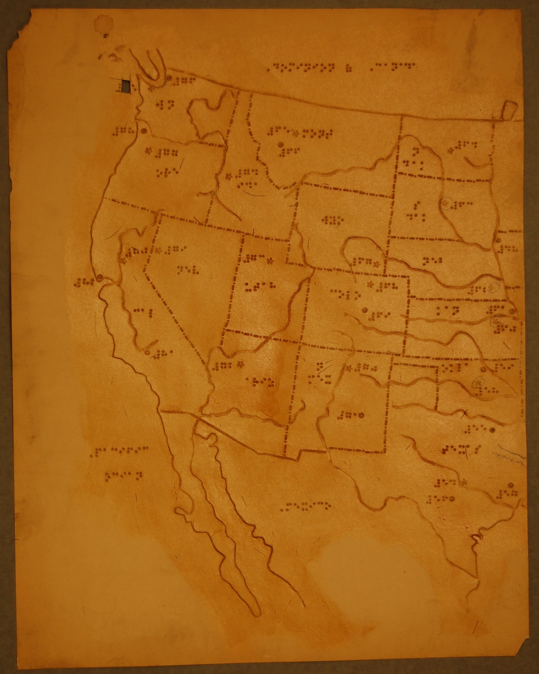 - Mapped area is shellacked and indicates states, major rivers, capitals, and major cities; entire landmass is smooth; braille labeling in English provides abbreviated names of states; capital cities are indicated by raised stars and other major cities by raised circles; cities are further identified by braille numbers; major rivers are indicated by depressed lines; raised lines of alternating dots and dashes identify state borders.