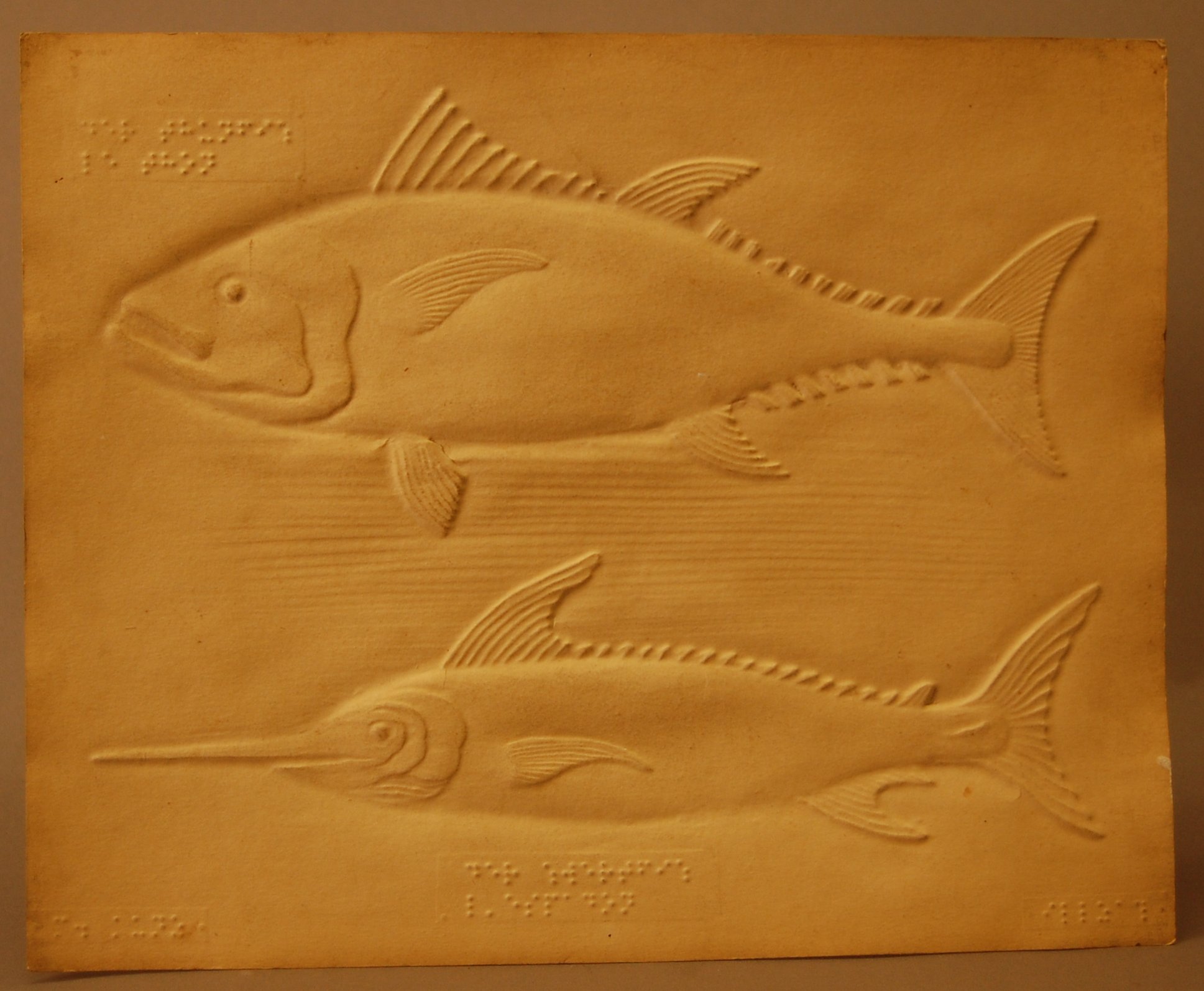 - Relief picture produced by Martin Kunz for instruction of blind students; may be a part of his Naturkunde [Natural History] series. Kunz' name and location are embossed in German braille, at bottom. Raised figure of the tuna is at the top; raised figure of the swordfish is at the bottom. Braille labeling identifies the common name of each fish in German and French. Raised horizontal lines in the background between the two figures may represent water. Backsides of the figures are filled with gesso.