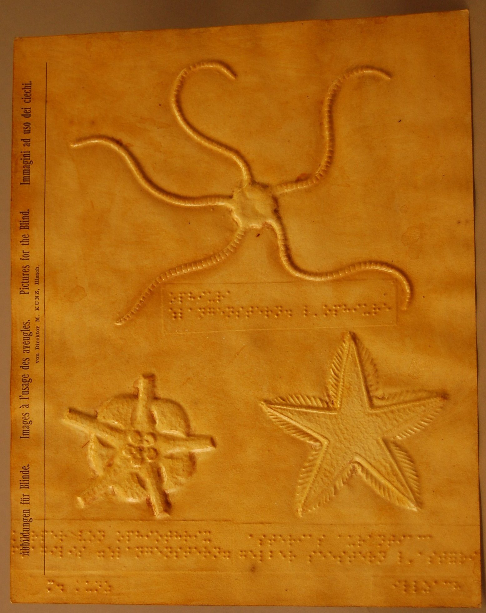 - Relief picture produced by Martin Kunz for instruction of blind students; may be a part of his Naturkunde [Natural History] series. "Pictures for the Blind" is printed in German, French, English, and Italian as follows: Abbildungen fur Blinde. Images a l'usage des aveugles. Pictures for the Blind. Immagini ad uso dei ciechi. Below this is printed "von Direktor M. Kunz, Illzach." Creator's name and location are embossed in German braille, at bottom. Three raised figures of starfish: the serpent star, also known as the brittle star (top figure); the underside of the serpent star (lower left); and the yellow starfish (lower right). Braille labeling provides the names of the starfish in German and Latin. Entire frontside of picture is varnished; backside of each figure is also varnished.