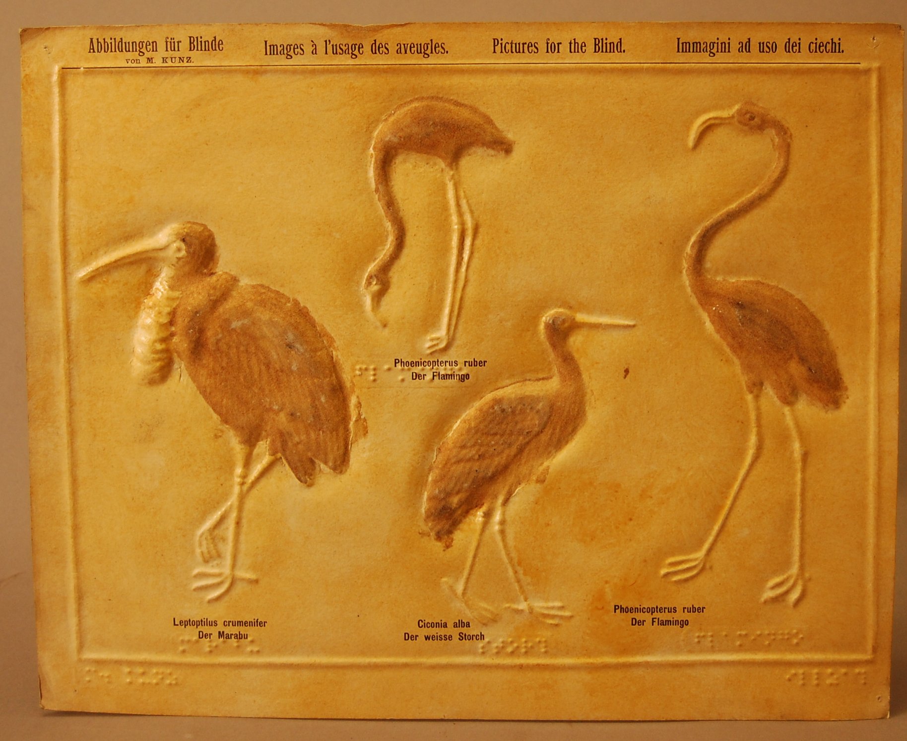 - Relief picture produced by Martin Kunz for instruction of blind students; may be a part of his Naturkunde [Natural History] series. "Pictures for the Blind" is printed at the top in German, French, English, and Italian as follows: Abbildungen fur Blinde. Images a l'usage des aveugles. Pictures for the Blind. Immagini ad uso dei ciechi. Below this is printed "von M. Kunz." Creator's name and location are embossed in German braille, at bottom. Four images include two of the flamingo and one each of the marabou and the stork. Flocking has been applied to the feathered portions of the birds. Common names of the birds are identified in German in both braille and print; Latin species provided in print. Front of picture is varnished; small pinhole in each corner. Museum has several of Kunz' relief pictures and maps in its collection. Martin Kunz was director of the Blind Institute at Illzach, Germany and a leading producer of relief pictures and maps in the 1890s. .