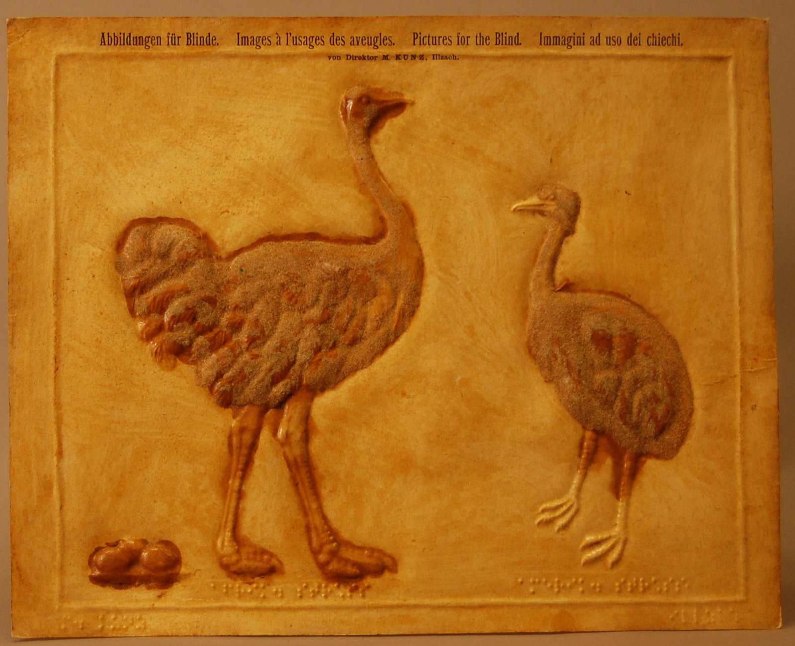 - Relief picture produced by Martin Kunz for instruction of blind students; may be a part of his Naturkunde [Natural History] series. "Pictures for the Blind" is printed at the top in German, French, English, and Italian as follows: Abbildungen fur Blinde. Images a l'usage des aveugles. Pictures for the Blind. Immagini ad uso dei chiechi. Below this is printed "von Direktor M. Kunz, Illzach." Creator's name and location are embossed in German braille, at bottom. On the left is the African Ostrich and, on the right, the American Ostrich (actually a rhea, South American flightless bird). The feathered areas of the birds are covered with gray flocking. Three raised eggs are in the lower left corner. German braille labeling beneath each bird provides the common name. Entire frontside of picture is varnished; backside of raised illustrations are filled with gesso. Some of the flocking has worn away. Museum has several of Kunz' relief pictures and maps in its collection. Martin Kunz was director of the Blind Institute at Illzach, Germany and a leading producer of relief pictures and maps in the 1890s. --Tactile Pictures (Eriksson, 1998, p. 107).