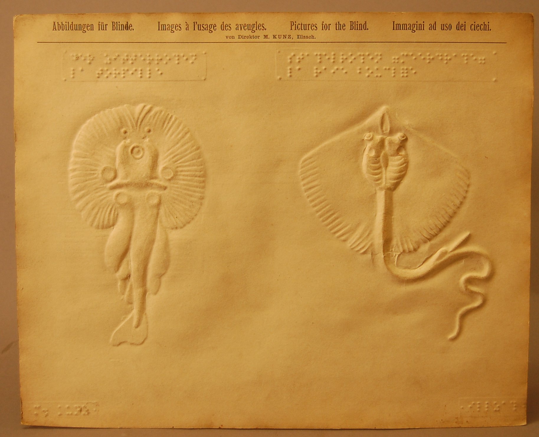 - Relief picture produced by Martin Kunz for instruction of blind students; may be a part of his Naturkunde [Natural History] series. "Pictures for the Blind" is printed at the top in German, French, English, and Italian as follows: Abbildungen fur Blinde. Images a l'usage des aveugles. Pictures for the Blind. Immagini ad uso dei ciechi. Below this is printed "von Direktor M. Kunz, Illzach." Creator's name and location are embossed in German braille, at bottom. Two raised illustrations include the electric ray and the stingray; braille labeling above provides the German and French names for the rays. Somewhat soiled; raised area under the right eye of the right illustration has collapsed. Museum has several of Kunz' relief pictures and maps in its collection. Martin Kunz was director of the Blind Institute at Illzach, Germany and a leading producer of relief pictures and maps in the 1890s. --Tactile Pictures (Eriksson, 1998, p. 107).