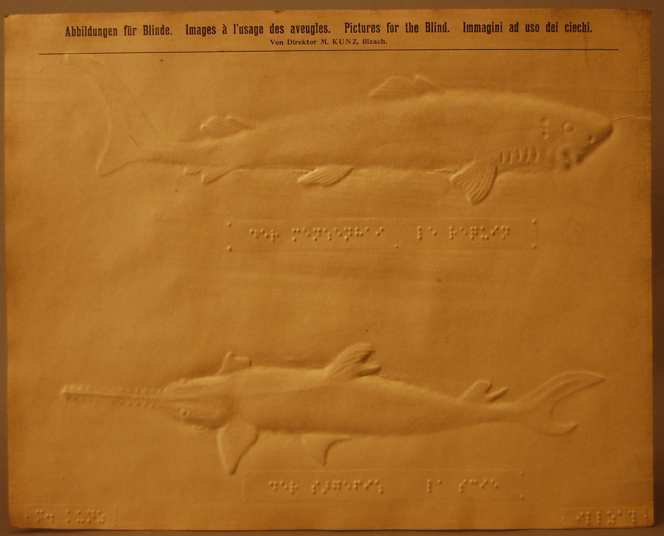 - Relief picture produced by Martin Kunz for instruction of blind students; may be a part of his Naturkunde [Natural History] series. "Pictures for the Blind" is printed at the top in German, French, English, and Italian as follows: Abbildungen fur Blinde. Images a l'usage des aveugles. Pictures for the Blind. Immagini ad uso dei ciechi. Below this is printed "von Direktor M. Kunz, Illzach." Creator's name and location are embossed in German braille, at bottom. Picture shows two marine fish, a shark (upper figure) and a sawfish (lower figure). Braille labeling beneath each figure provides the common name in German and French. Relief is somewhat worn. Museum has several of Kunz' relief pictures and maps in its collection. Martin Kunz was director of the Blind Institute at Illzach, Germany and a leading producer of relief pictures and maps in the 1890s. --Tactile Pictures (Eriksson, 1998, p. 107).