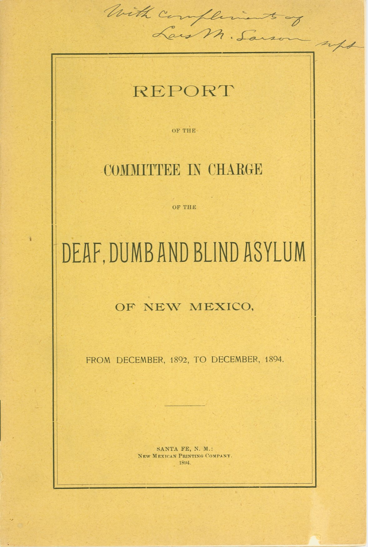 - This report provides a brief history of the school and its property and includes a list of expenditures. Noted is the superintendent's recommendation that the name of the school be changed from "asylum" to the New Mexico Institute for the Deaf, Dumb and Blind. Handwritten inscription of Superintendent Lars Larson on front cover, at top.