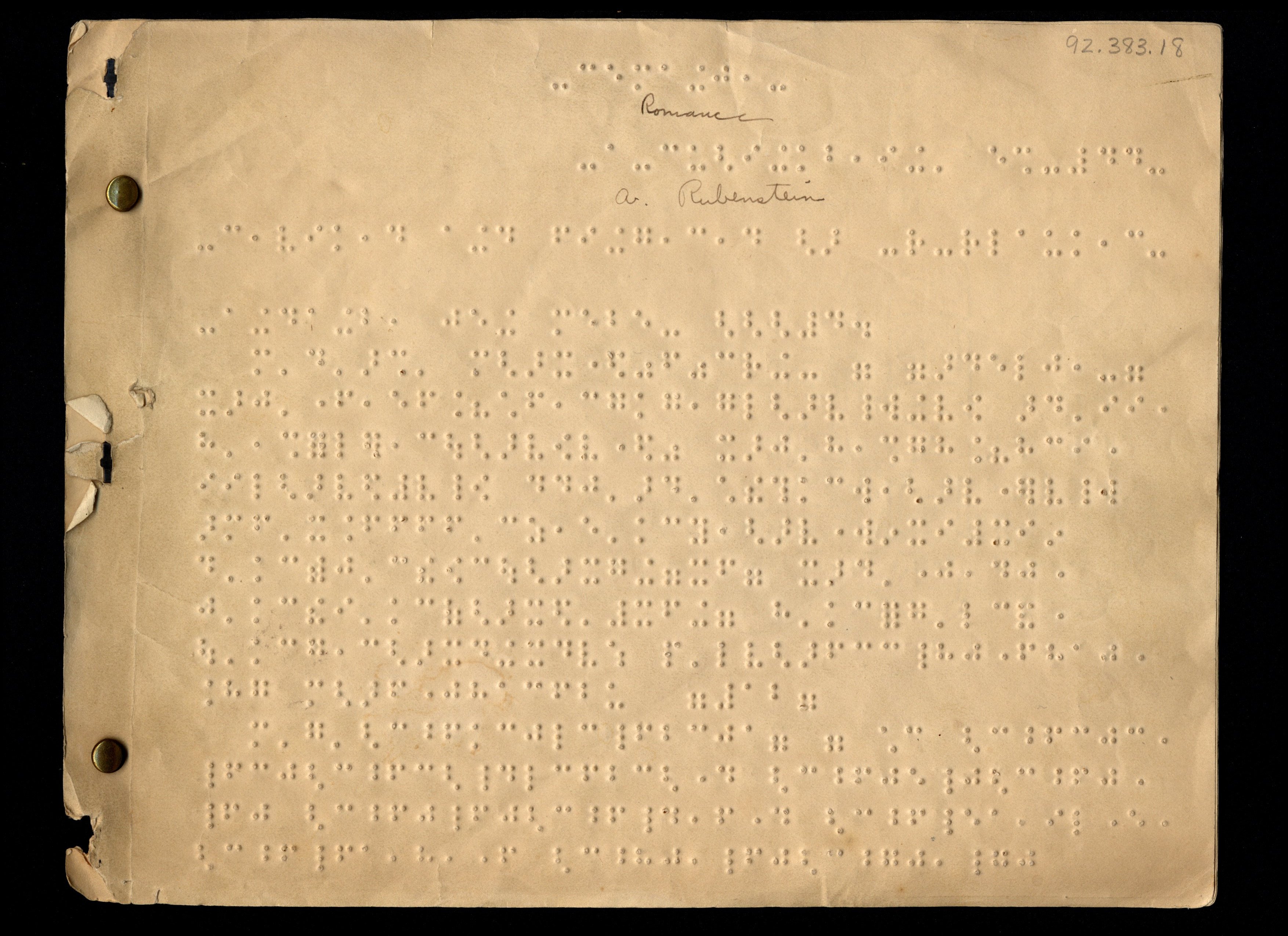 - Off white paper, secured at left margin with three tinplate clips and two brass round-head pins; single-sided embossing in Modified American Braille; revised and fingered by K. Klauser.