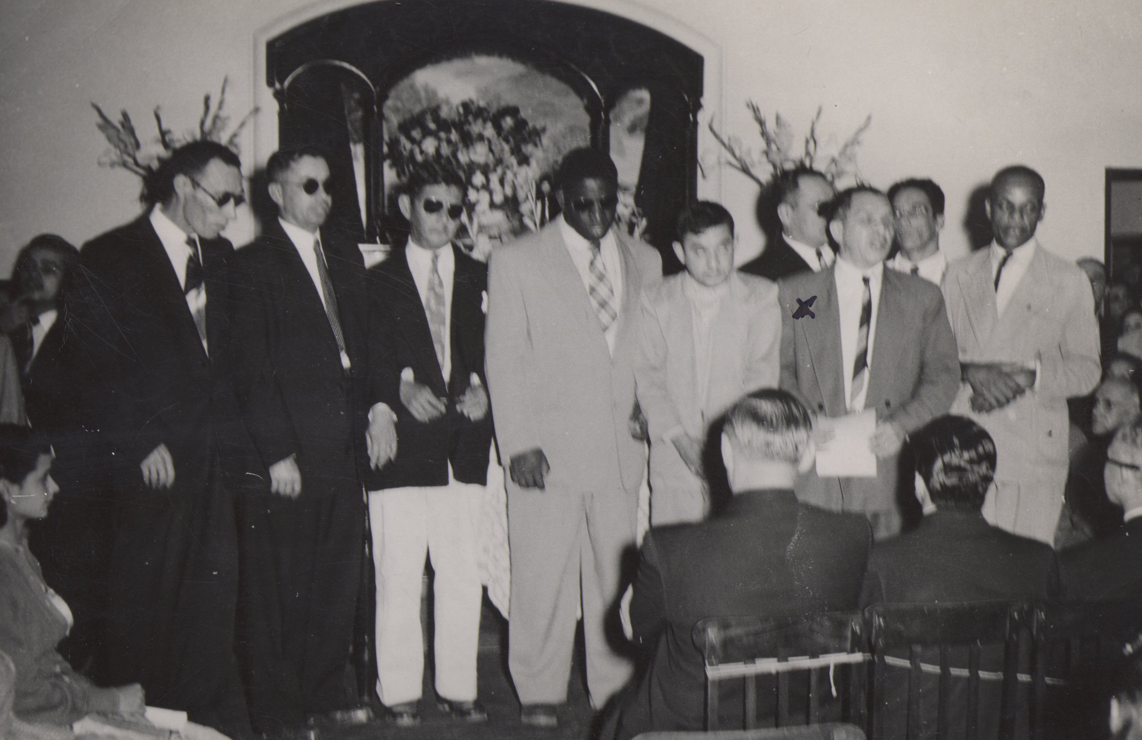 - BW print; line of men in suits and ties, many wearing dark glasses, singing, surrounded by seated audience members; captioned "Some of the blind of the Evangelical Institute for the Blind in Rio de Janeiro, Brazil, singing a male quartet, whose poetry and composition of the music was made by one of them. 1951".