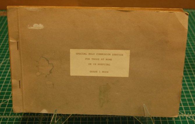 - Gray paper covers; stapled along left edge. Print label on front cover reads "Special Holy Communion Service For Those At Home Or In Hospital, Grade 1 Moon."