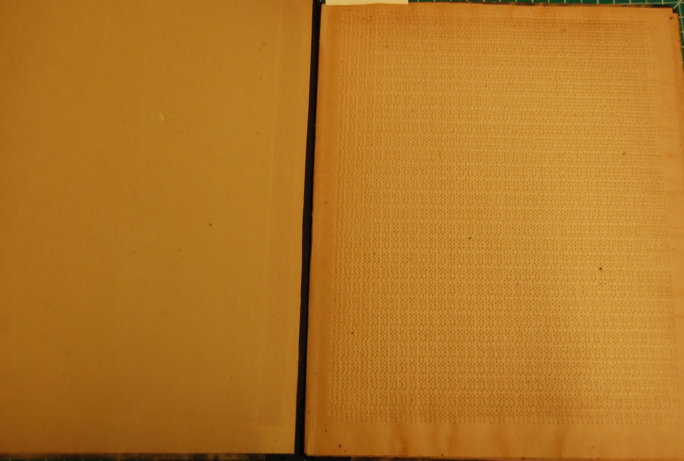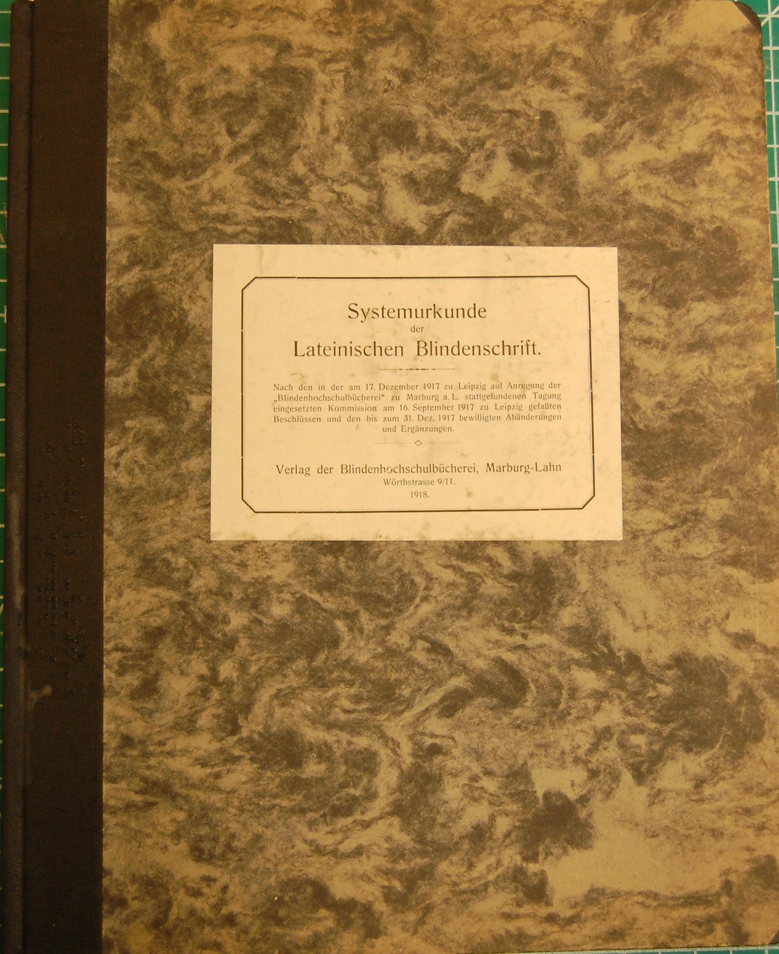 - Decisions, amendments and supplements resulting from a 1917 conference held in Marburg about the (Latin) braille system. Embossed in contracted braille; interpoint. Black/gray marbled paper over boards; black cloth tape along spine and tips of corners; pages thread-stitched. Braille labeling on tape that overlaps front cover. White printed label on front cover.