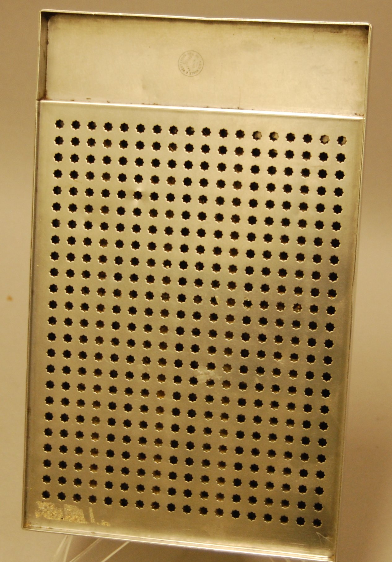 - Stainless steel rectangular frame with 432 stamped octagonal-shaped cells (18x24 grid); shallow tray at one end for holding type; stamped into the bottom of the tray is "Noble & Westbrook Mfg. Co., E. Hartford, Conn., U.S.A."