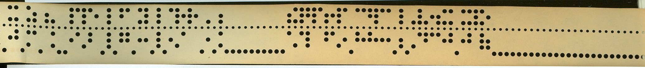 - Punched teletype tape containing braille text; ink printout of text, a garbled excerpt from Charles Dicken's "A Tale of Two Cities"; and a simbraille printout of same, with standard print numerals/computer code on reverse. a) tape b) printout c) simbraille printout