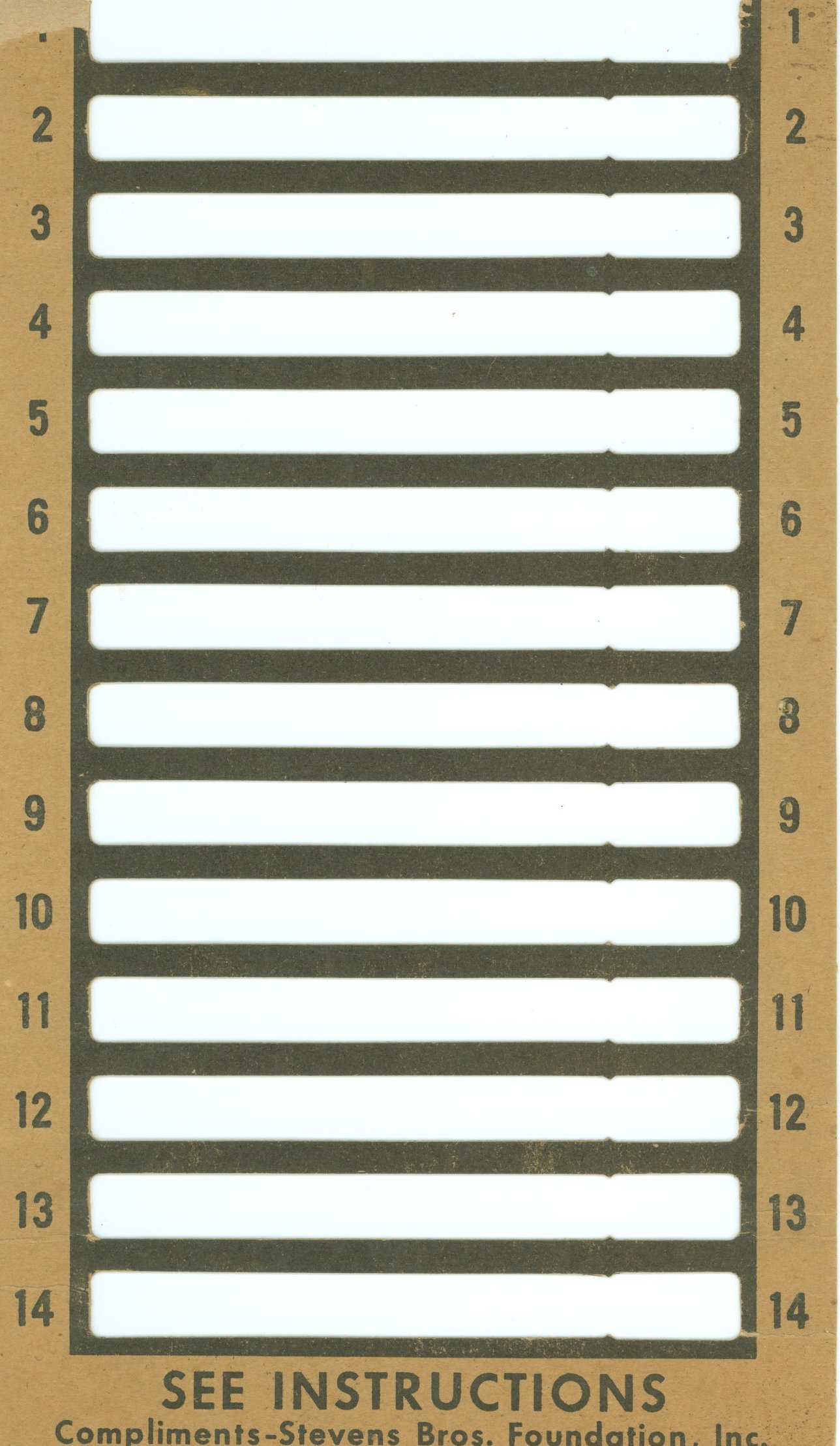 - Flexible cardboard template has one column of 14 horizontal rectangular openings ("windows") to guide handwriting. Instructions for use are printed on reverse; title taken from this information. "Steven Bros. Foundation, Inc." is printed on front at bottom margin.