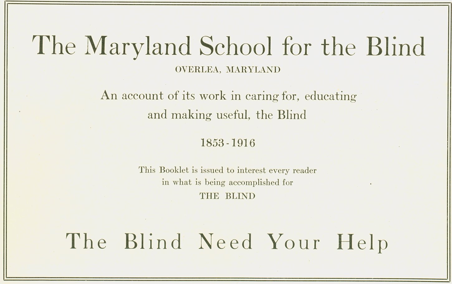 - Paperbound fundraising booklet. Contains text and black-and-white photo illustrations showing the school's buildings, students, and activities. Includes information about the Maryland Workshop for the Blind, conducted under the direction of the school. A loose letter, "An Appeal for the Blind," and a subscription card and envelope are included. .20a - booklet .20b - letter .20c - card .20d - envelope