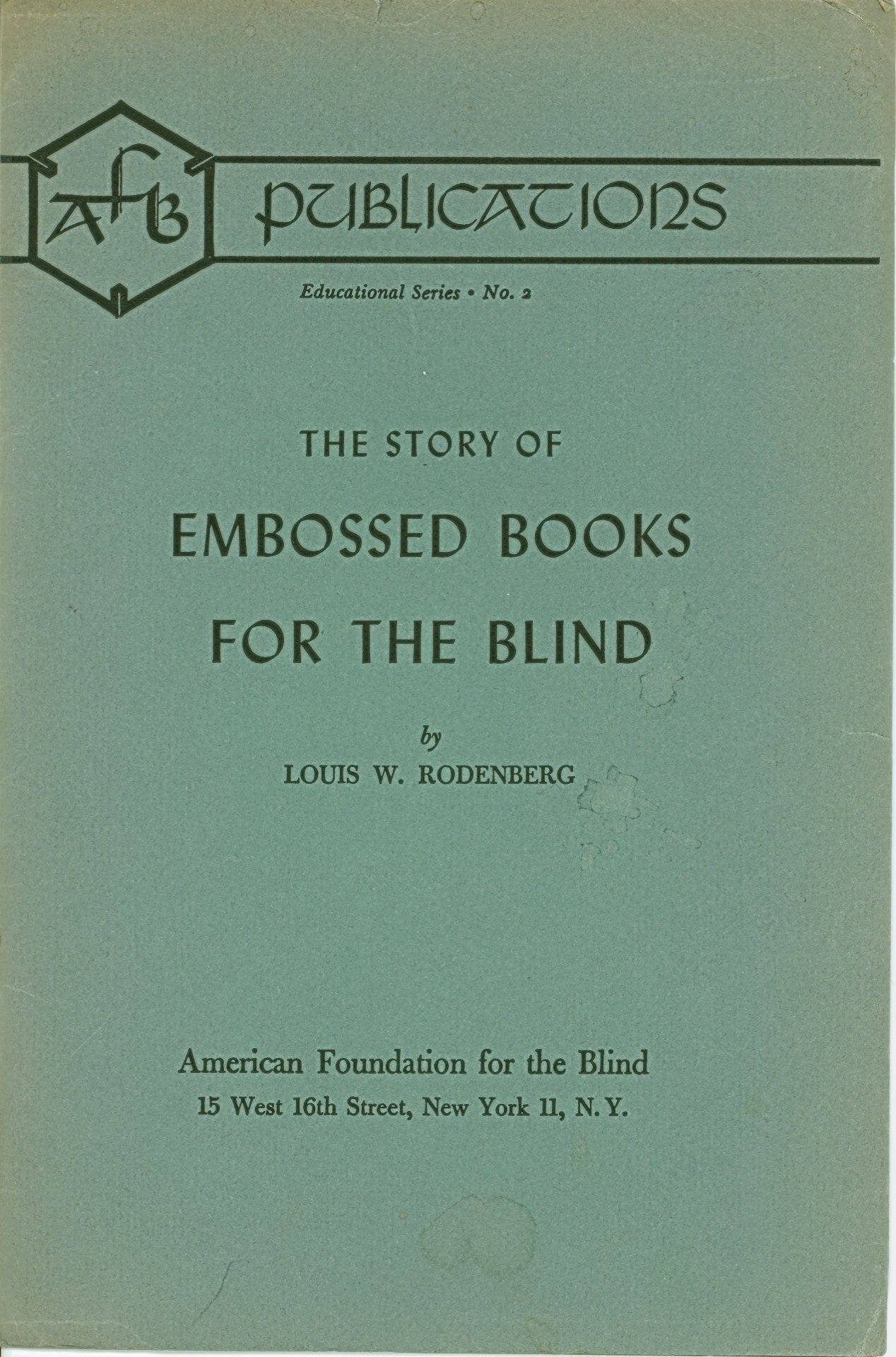 - Briefly describes the development of tactile systems for blind reading, the "ascendency" of braille, and the printing of braille books for blind readers. Paperbound, green cover. Museum has 2 copies (see 1997.812.3).