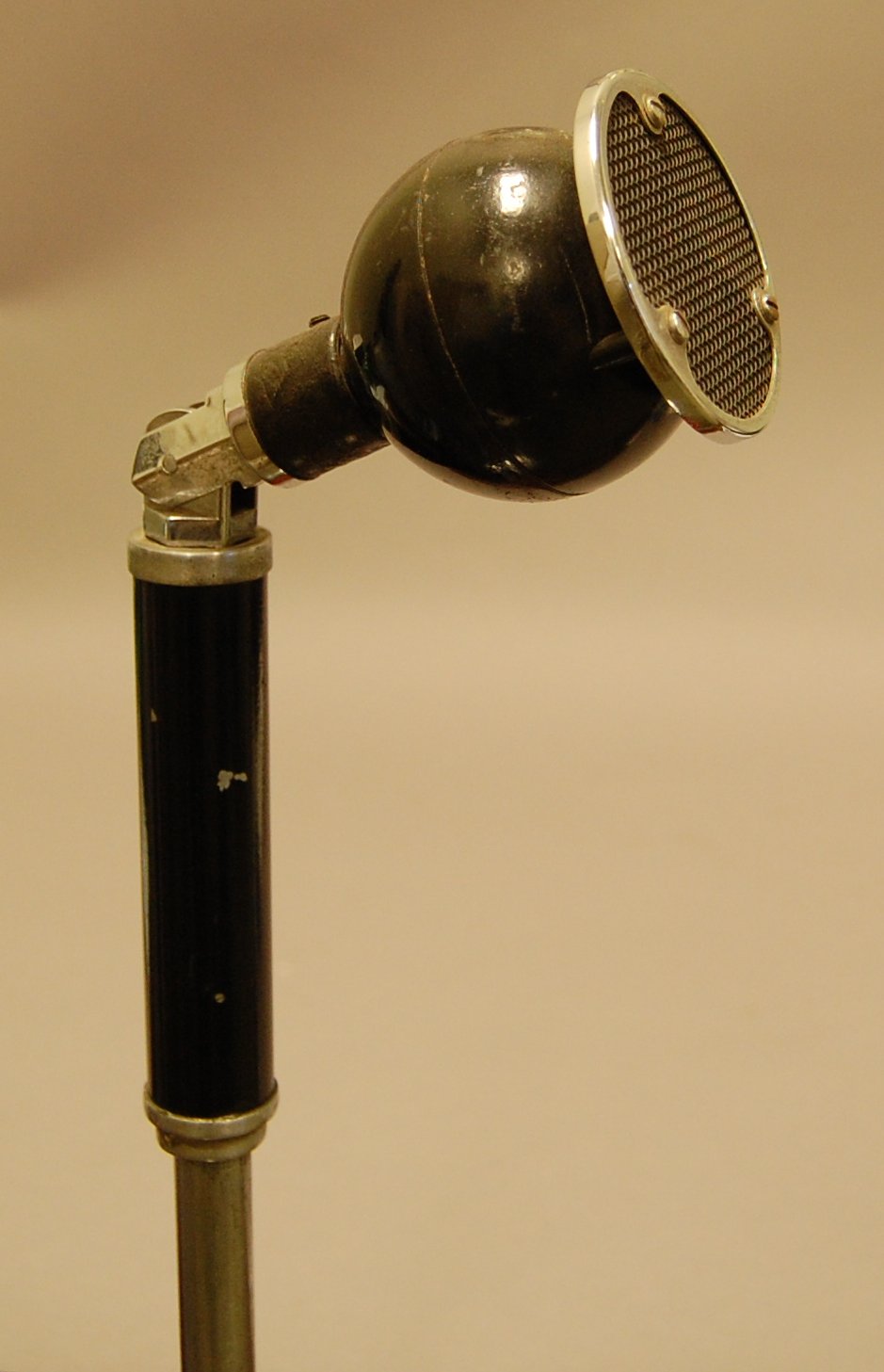 - Heavy round nickel-plated cast brass base with three tiered form, black rubber disk at base of stand pole, copper wire chase leads from base of pole to edge of base; nickel-plated brass adjustable height 2-piece pipe stand pole, thumb washer in middle allows smaller diameter upper section to slide upward and lock in place; black enameled grip at top of pole; microphone mounted to pole on hinge allowing angle to be adjusted; microphone is ball-shaped with "acoustic baffle assembly" mounted to top with three screws; cast into body "Western Electric U.S.A. 630A 1180."