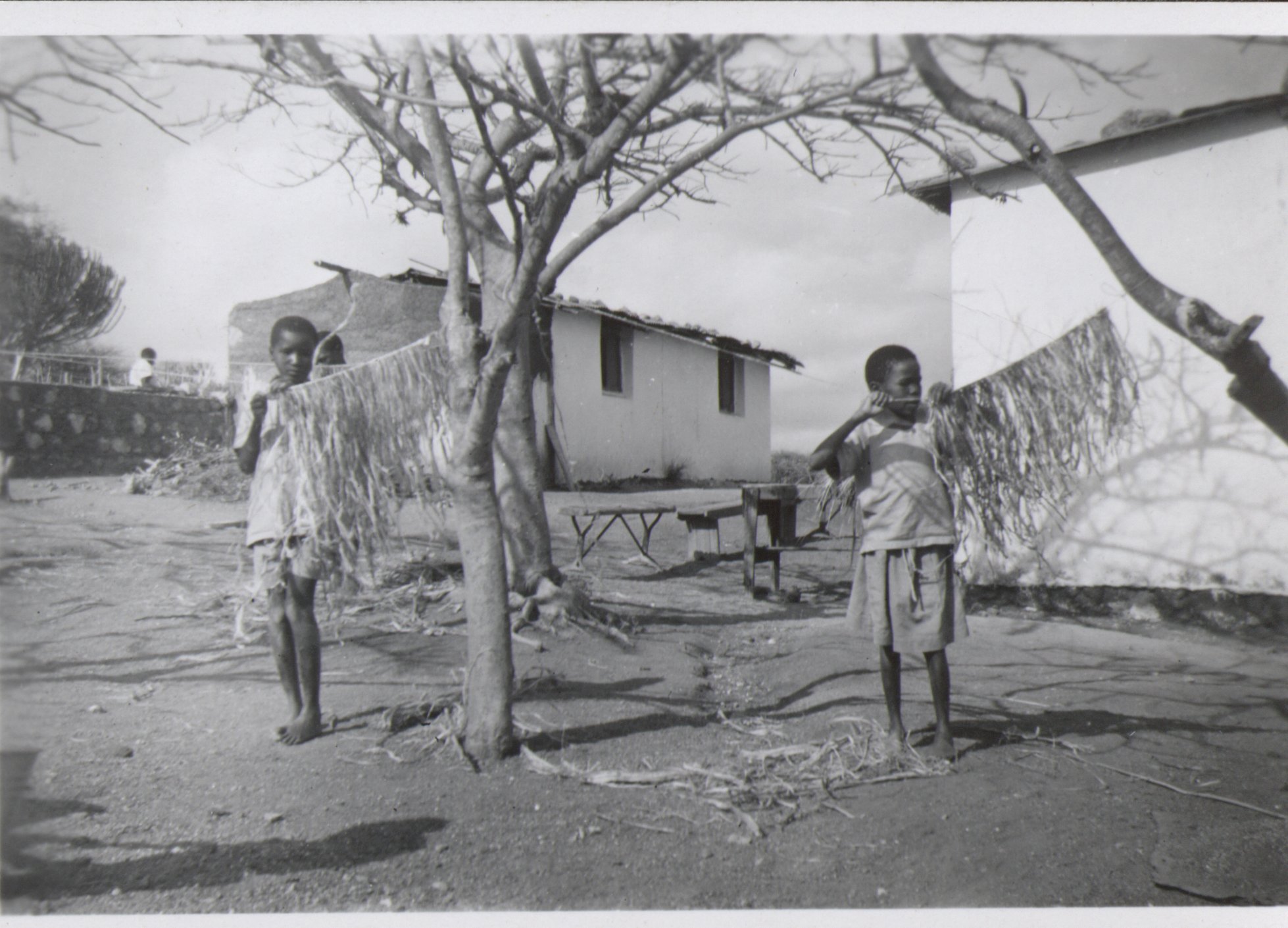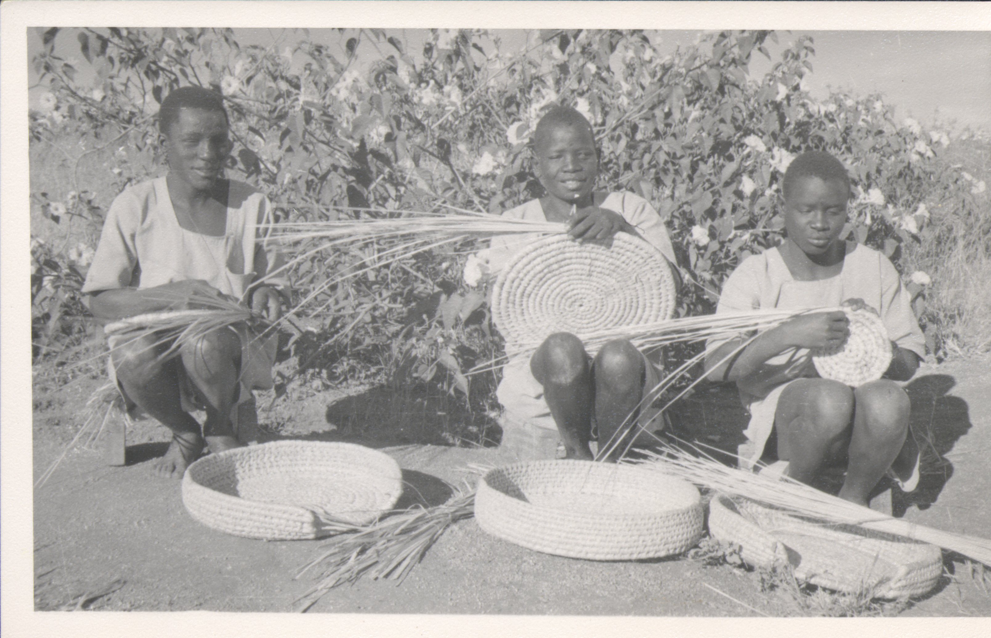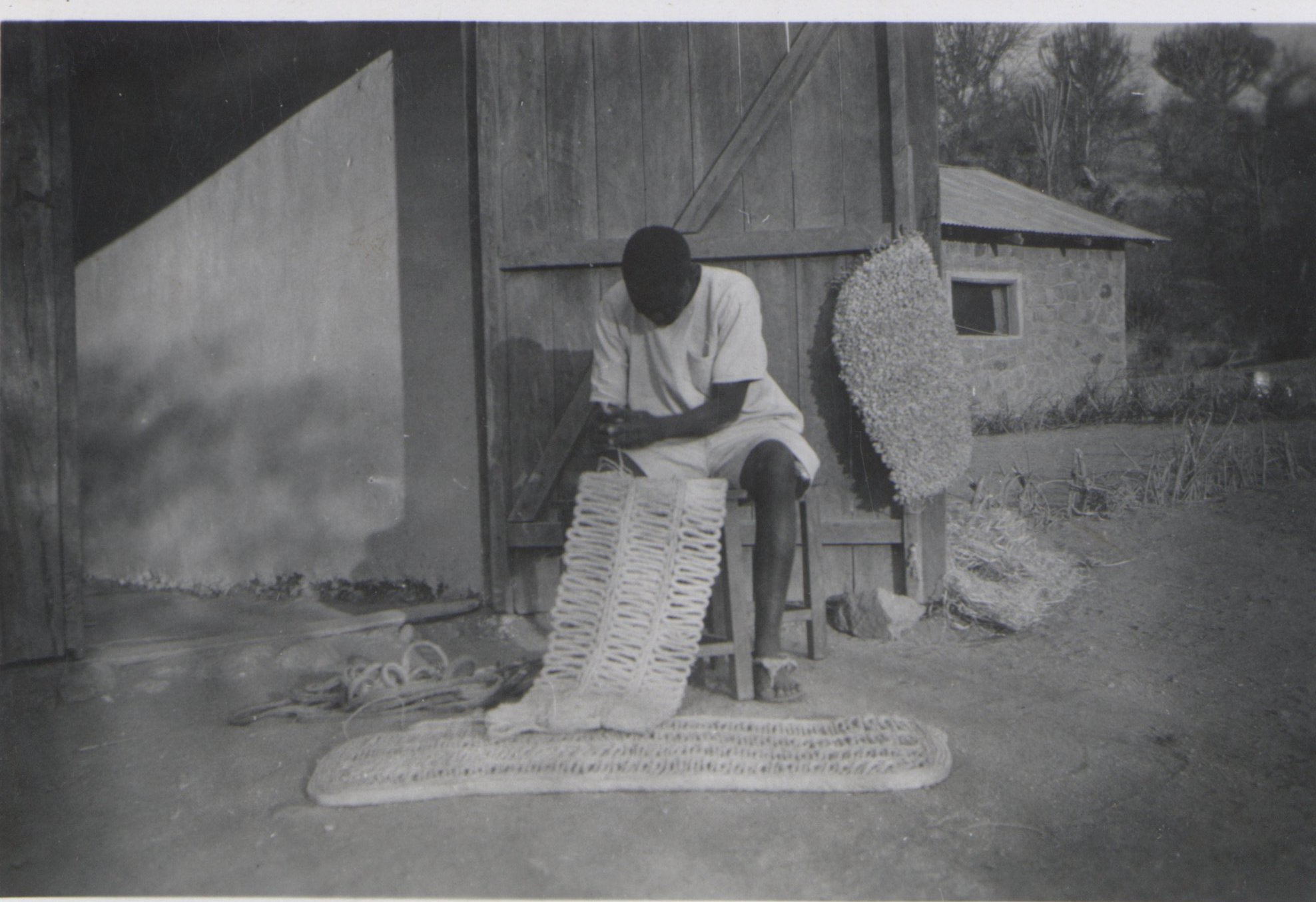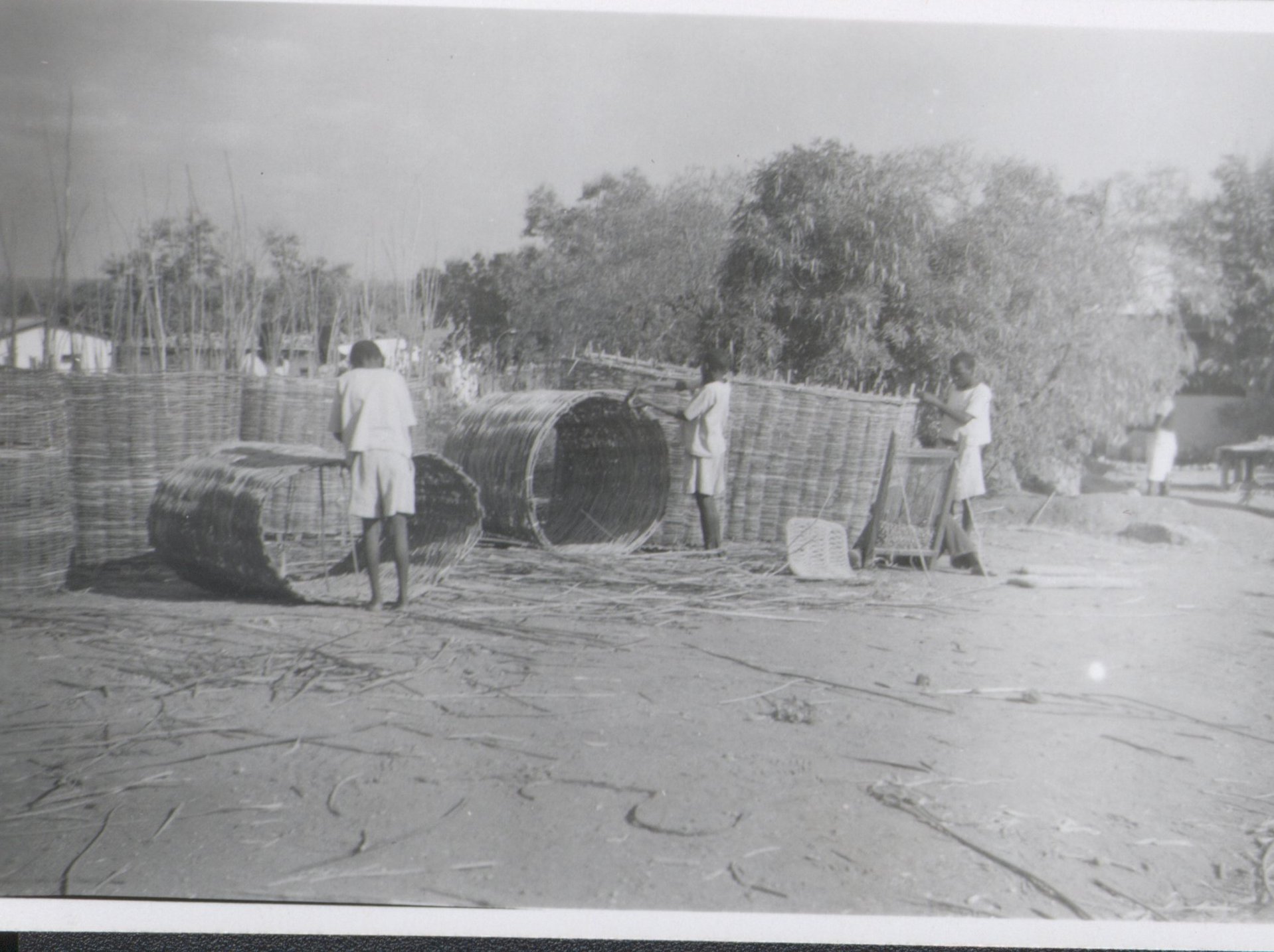 - .512: BW picture postcard; three African boys stand holding two bowls each; brush and a dirt field fill the background; captioned Boys with basins and plates ready for food"; 3.5 x 5.5"; .513: BW picture postcard; three African children in white uniforms crouch, weaving broad shallow baskets; 3.5 x 5"; .514: BW print; thin African boy in ragged garment stands in front of a whitewashed stone wall; captioned "One of our first pupils. This boy is now reading English Braille 1st Grade & newly Grade 2. He is learning to 'touch type' on an ordinary typewriter. 1950"; 3.375 x 2.375"; .515: BW print; three young African men weaving large round baskets; captioned "Boys making native corn bins"; 3.375 x 2.375"; .516: BW print; two African boys stringing strips of bark onto cords suspended from two small trees; white buildings in the background; captioned "The building with the windows is our School. The small wall on the left is the wall of the hostel being built. The boys are making baskets from the bark of a tree. The boy on the right is the boy in the photo 'one of our first boys.' Buigiri 1952"; 3.375 x 2.375"; .517: BW print; African man on right sits at small table writing braille on Stainsby-Wayne Braillewriter; Causasian man sits at left; captioned "Our lead teacher Paulo Milangasi + Caftain F. Varley. Paulo is using a Stainsby Machine and is getting ready to make notes as he was going out preaching in the villages. 1952"; 3.375 x 2.375"; .518: BW print; stone building with tin gable roof; captioned "A hostel we built in 1951 to accomodate 20 boys at Buigiri"; 3.375 x 2.375"; .519: BW print: African boy sits on stool in front of wooden door, weaving a large oval mat; captioned "Mat Making 1952"; 3.375 x 2.375"; .520: BW print: young African man holdig a bundle wrapped in paper and tied with string; dirt field and low brush in background; captioned "This boy was taught in our school then read for 4 years with sighted boys in Standard 5 to 8. Now he is reading with sighted boys in a secondary school. He is the only blind boy in Tangayika reading in a Secondary Scholl with sighted boys"; 3 x 4.375"; .521: BW print: four African boys sit in front of a concrete block building, weaving mats; 3 x 4.375".