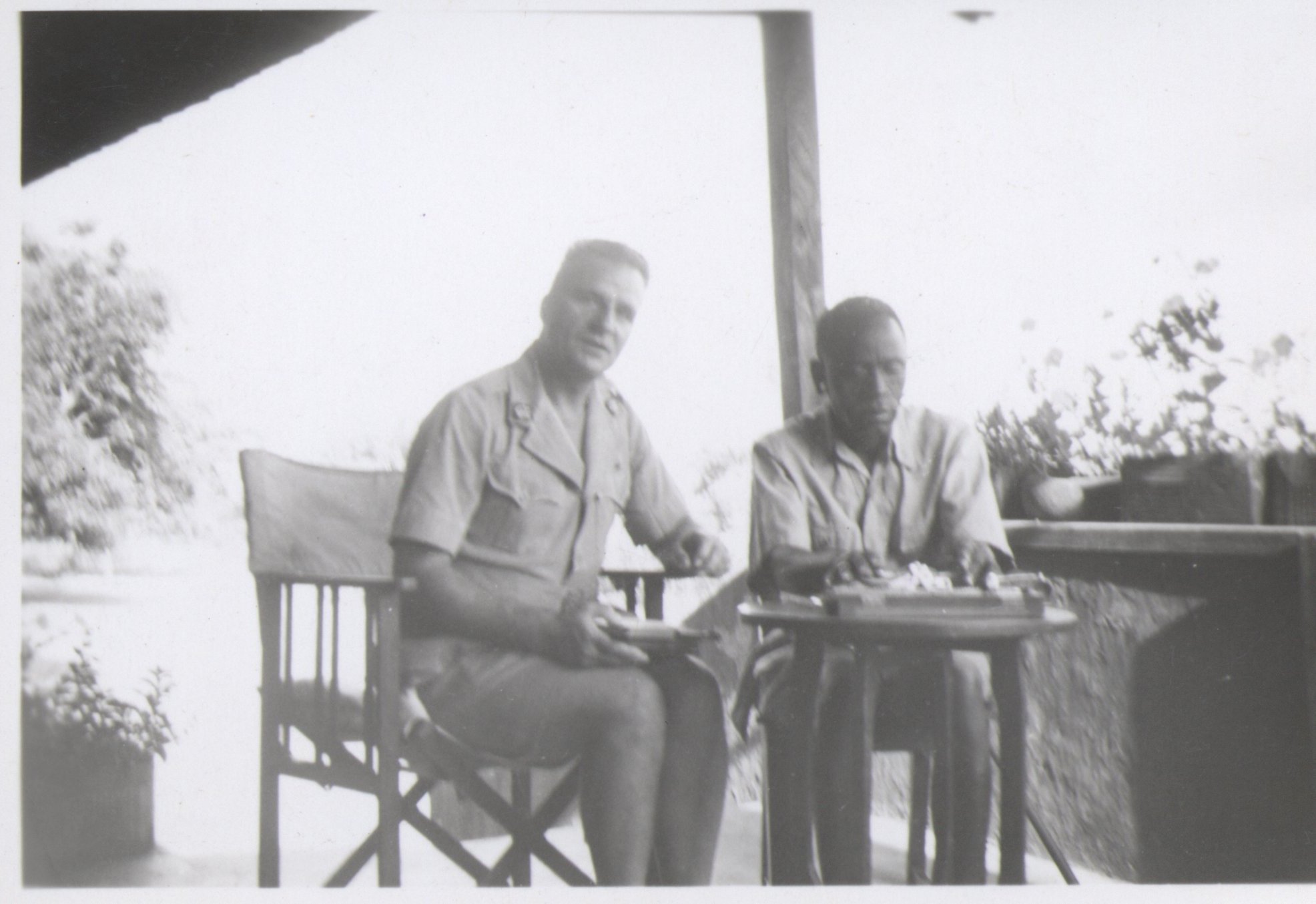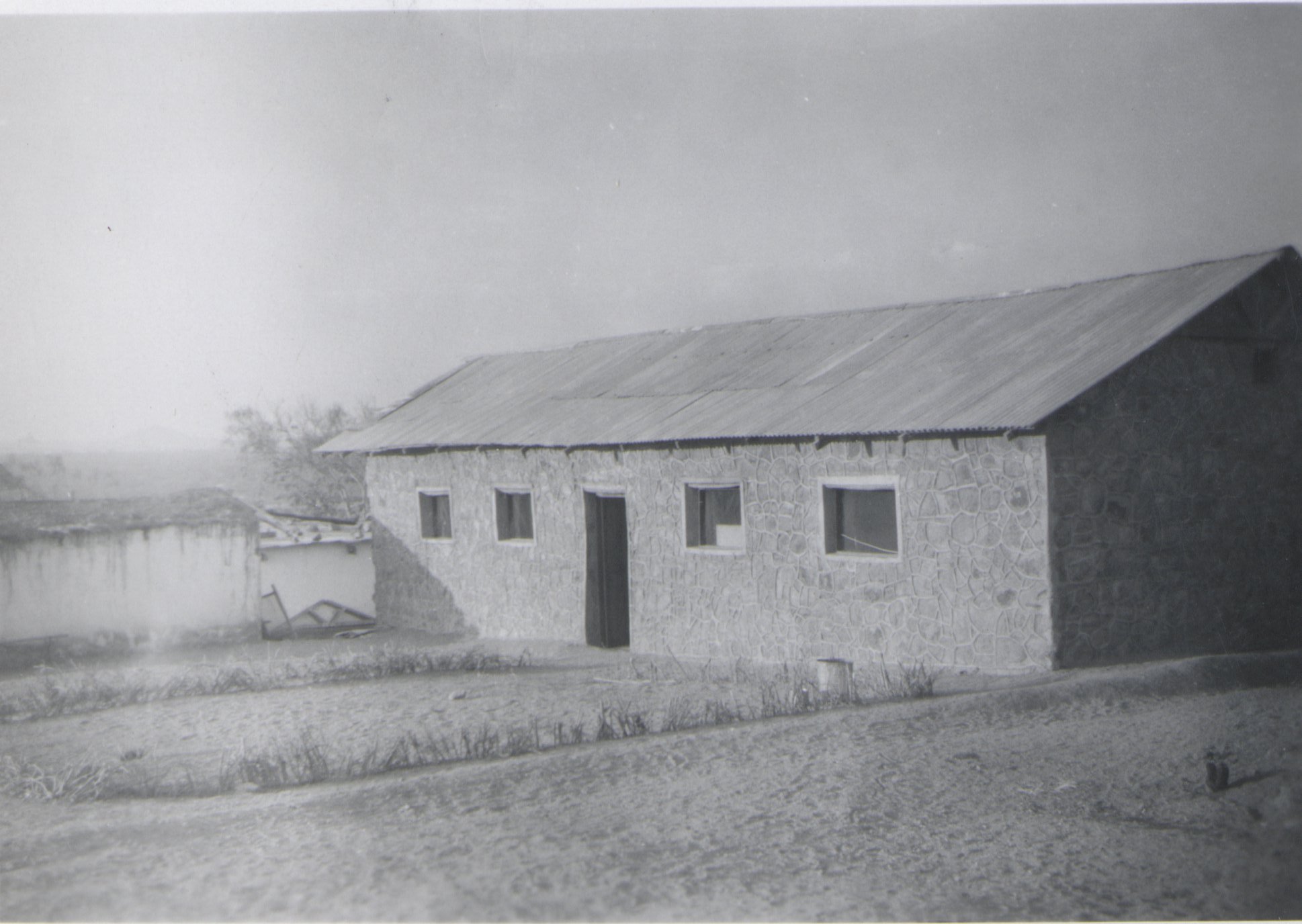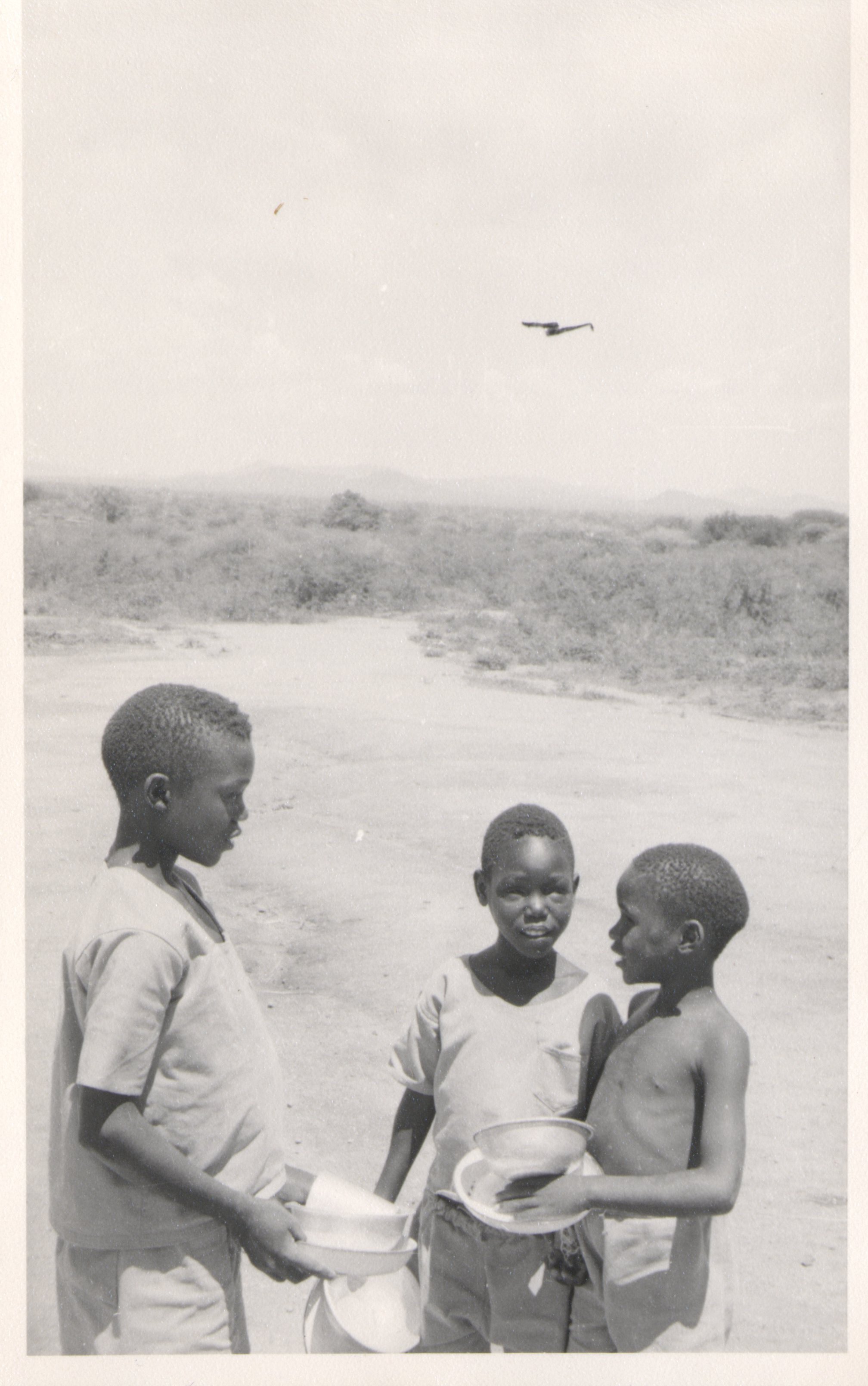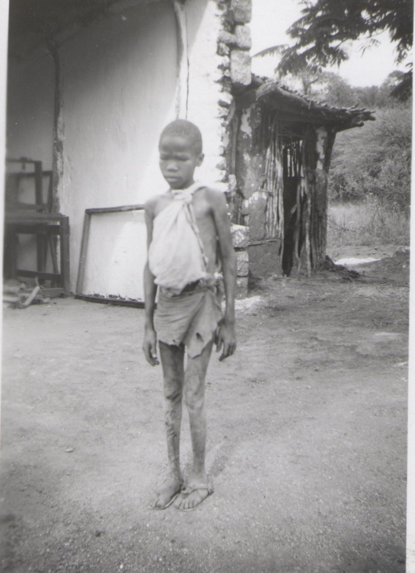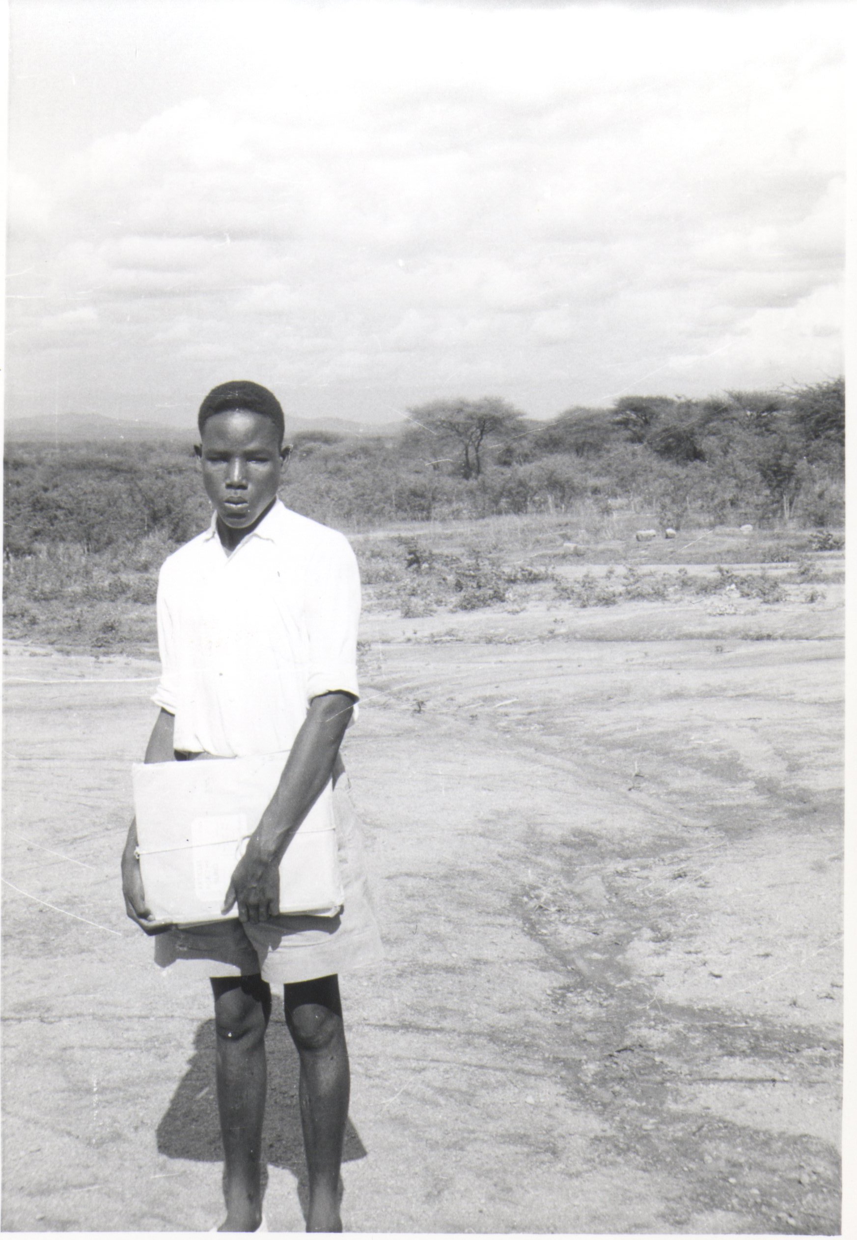 - .512: BW picture postcard; three African boys stand holding two bowls each; brush and a dirt field fill the background; captioned Boys with basins and plates ready for food"; 3.5 x 5.5"; .513: BW picture postcard; three African children in white uniforms crouch, weaving broad shallow baskets; 3.5 x 5"; .514: BW print; thin African boy in ragged garment stands in front of a whitewashed stone wall; captioned "One of our first pupils. This boy is now reading English Braille 1st Grade & newly Grade 2. He is learning to 'touch type' on an ordinary typewriter. 1950"; 3.375 x 2.375"; .515: BW print; three young African men weaving large round baskets; captioned "Boys making native corn bins"; 3.375 x 2.375"; .516: BW print; two African boys stringing strips of bark onto cords suspended from two small trees; white buildings in the background; captioned "The building with the windows is our School. The small wall on the left is the wall of the hostel being built. The boys are making baskets from the bark of a tree. The boy on the right is the boy in the photo 'one of our first boys.' Buigiri 1952"; 3.375 x 2.375"; .517: BW print; African man on right sits at small table writing braille on Stainsby-Wayne Braillewriter; Causasian man sits at left; captioned "Our lead teacher Paulo Milangasi + Caftain F. Varley. Paulo is using a Stainsby Machine and is getting ready to make notes as he was going out preaching in the villages. 1952"; 3.375 x 2.375"; .518: BW print; stone building with tin gable roof; captioned "A hostel we built in 1951 to accomodate 20 boys at Buigiri"; 3.375 x 2.375"; .519: BW print: African boy sits on stool in front of wooden door, weaving a large oval mat; captioned "Mat Making 1952"; 3.375 x 2.375"; .520: BW print: young African man holdig a bundle wrapped in paper and tied with string; dirt field and low brush in background; captioned "This boy was taught in our school then read for 4 years with sighted boys in Standard 5 to 8. Now he is reading with sighted boys in a secondary school. He is the only blind boy in Tangayika reading in a Secondary Scholl with sighted boys"; 3 x 4.375"; .521: BW print: four African boys sit in front of a concrete block building, weaving mats; 3 x 4.375".