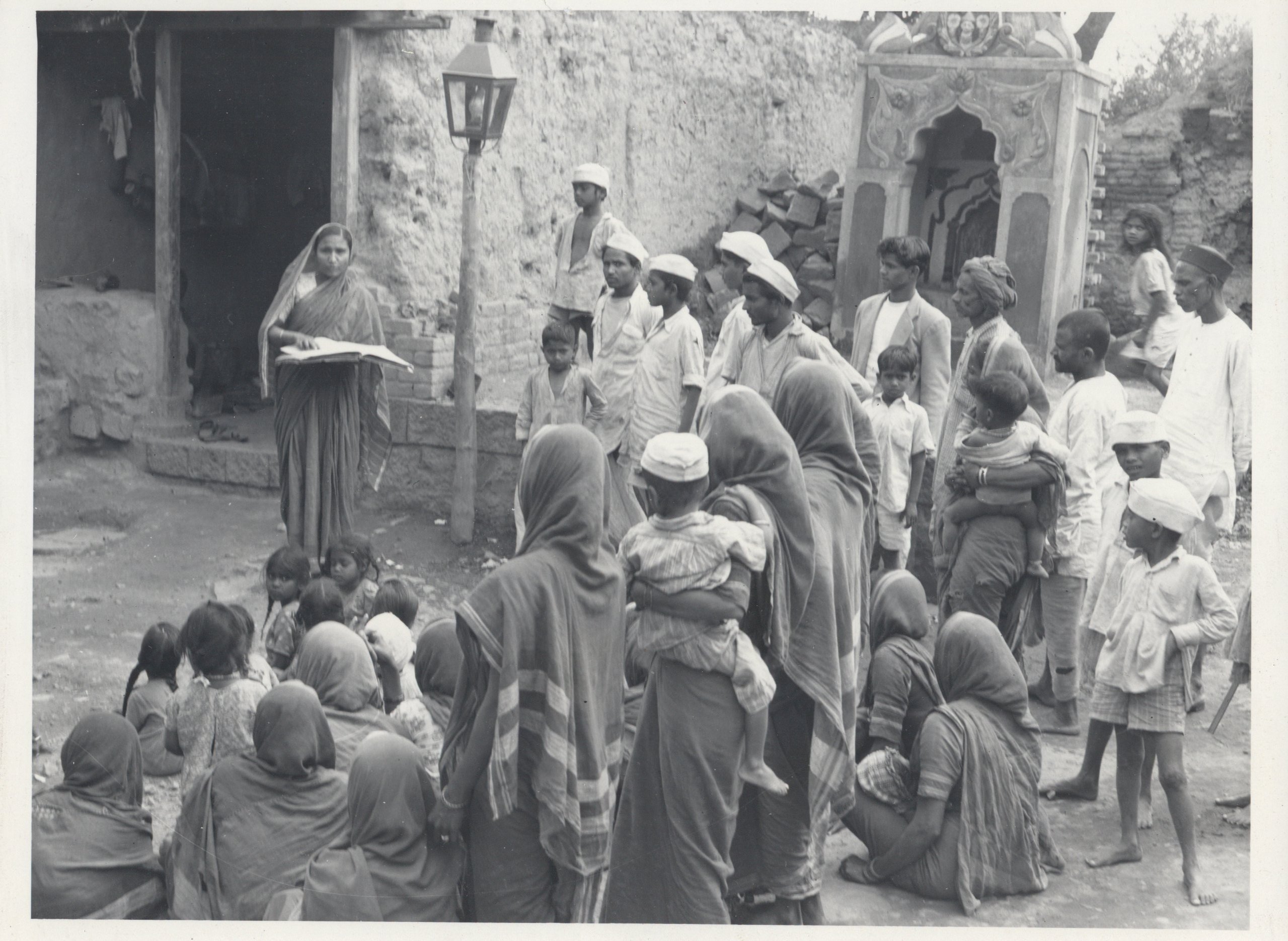 - BW print; Indian woman in sari with head wrapped stands at left, her hand on an open book; a mud walled building is behind her; a large group of Indian men, women, and children are gathered at right, listening; behind the crowd is a small religious shrine; captioned "Blind woman reading Bible in village.