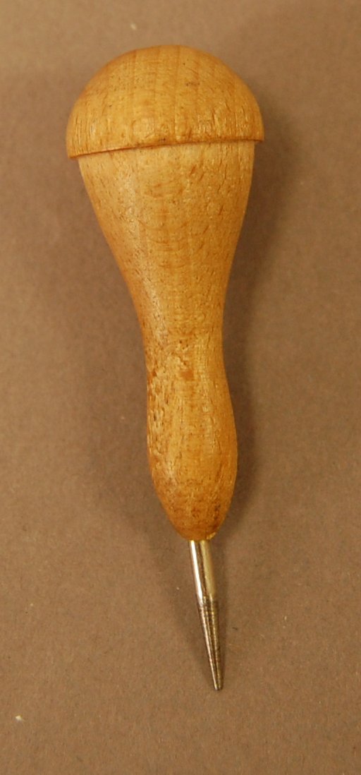 - Turned wooden handle; hourglass-shaped with cap top; light-color wood, natural finish; steel tip; for use with a slate.