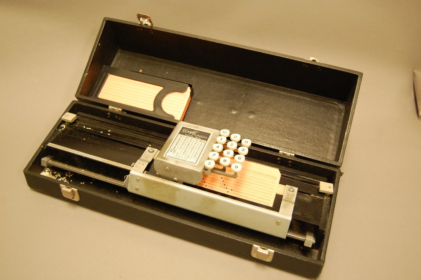 - Mechanical IBM card punch for visually impaired programmers based on the Hollerith Keypunch Code. This code is similar to braille and was fairly easy for braille readers to learn. (Sighted programmers used a typewriter keyboard.) A label on top of the punch reads "Wright Punch Model 2600, Wright Line, Worcester, Mass. USA." It also lists the key numbers, and letter and symbols code. The card punch has 13 keys attached to a movable carriage. Letters and punctuation marks are made by pressing multiple keys, and a spacing key advances the carriage. The keys punched holes into the IBM card placed beneath the carriage. Eighty columns can be punched. The card punch has a black carrying case. The lid is hinged and has a handle on top of it. A card holder is attached to the inside of the lid. Metal clasps keep the case securely closed.